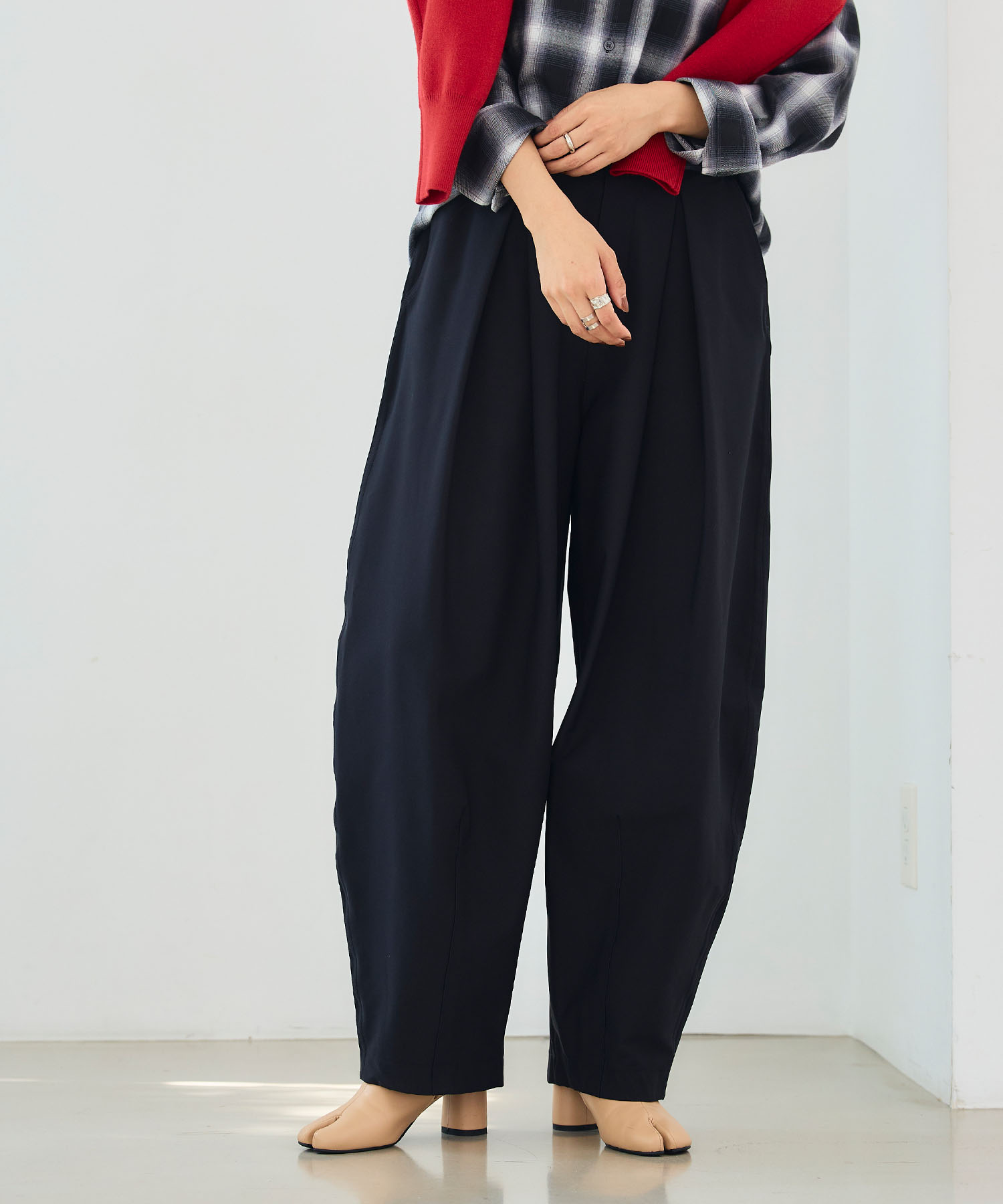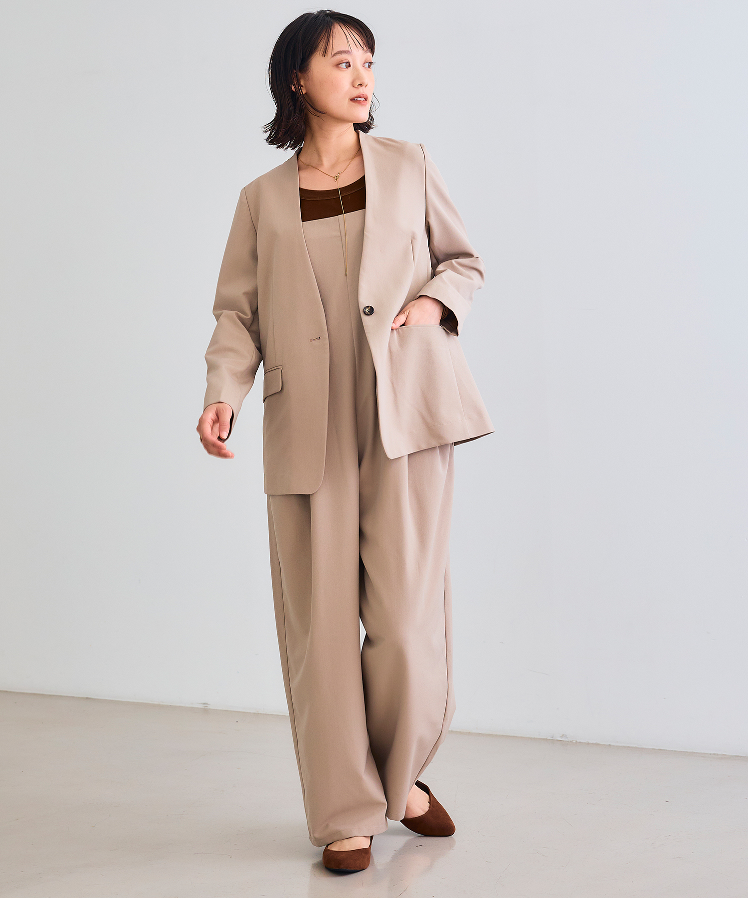 ジャケットを重ねるだけで、オールインワンが通勤にちょうどいい大人な表情に。ゆとりのあるシルエットが動くたびにきれいな縦ラインをつくります。無理なくきちんと見えて、仕事の日にも心地よく着られるオフィスカジュアルです。