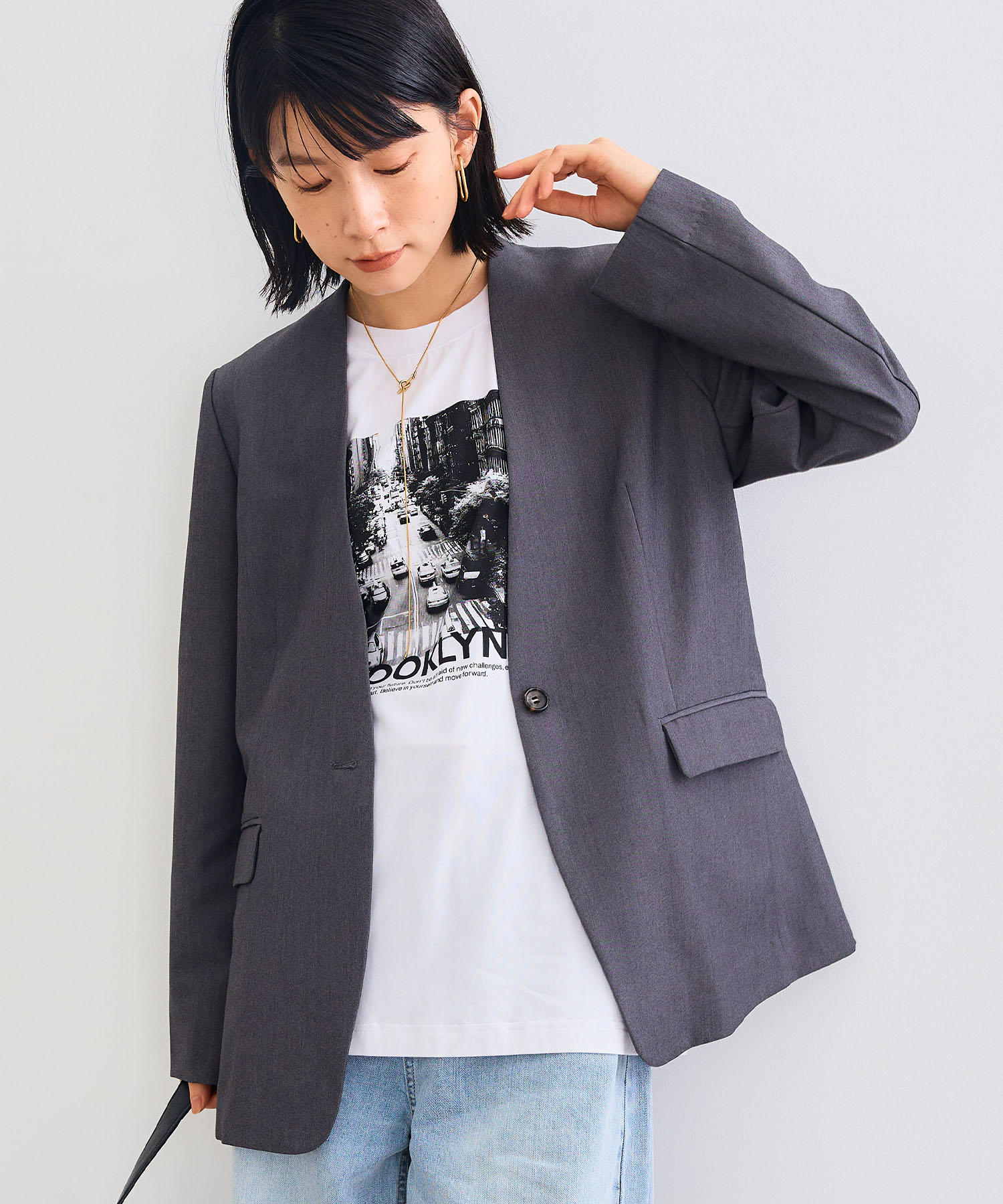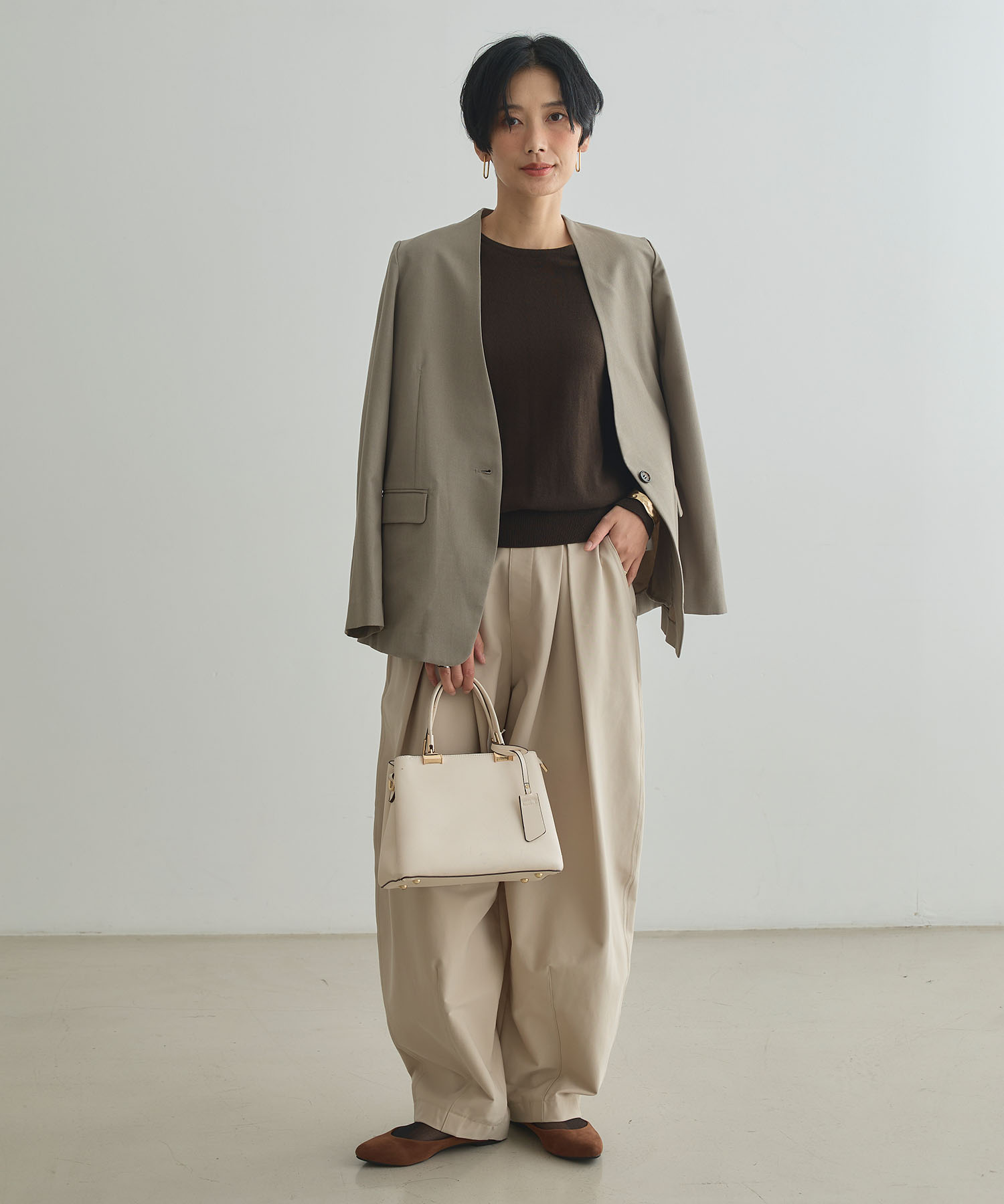 ベージュのノーカラージャケットに、ブラウンのニットと淡いボトムを合わせた優しげなワントーンコーデ。ノーカラージャケットは、首もとが端正に見え、無理のないきれいめ感の出るスタイルが完成します。