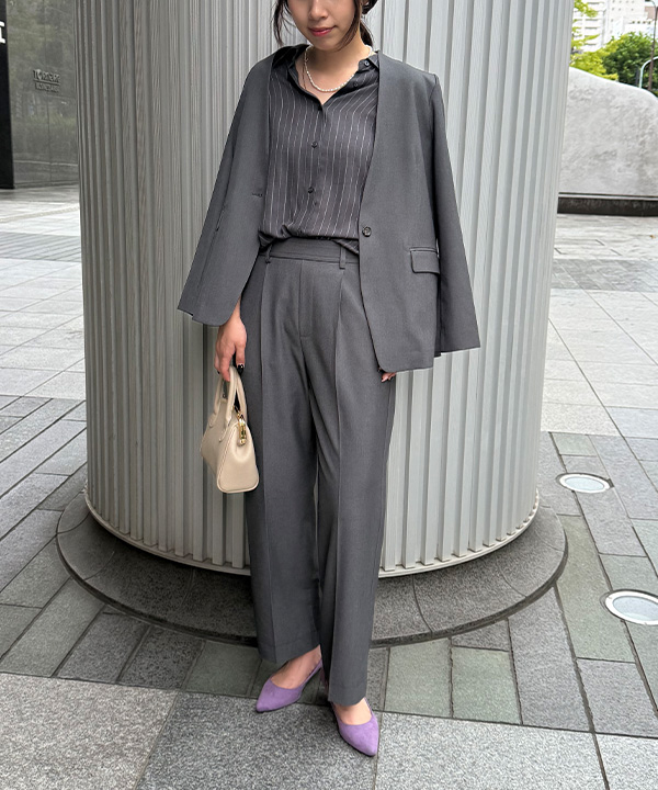 首元がすっきり見せるノーカラージャケットが、ストライプシャツのきちんと感を引き立てるセットアップコーデ。全体を同色でまとめることで、冬でもラインが美しく整い、かしこまりすぎない知的な通勤スタイルが叶います。