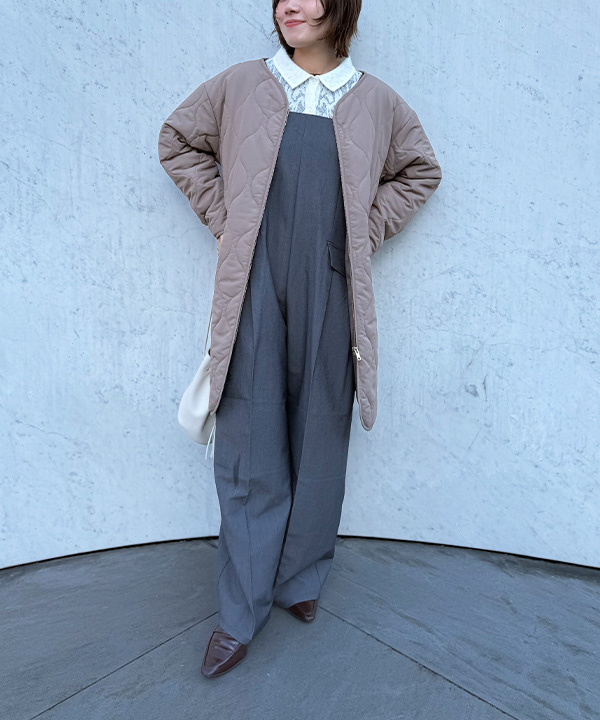 冬の通勤にうれしい軽やかな着心地のキルティングコートを合わせたレイヤードスタイル。縦ラインを強調するオールインワンは、アウターを重ねてもシルエットを崩さず動きやすさも確保。体型カバーも叶い日常の通勤シーンに寄り添う大人の装いに。