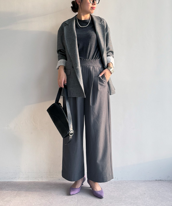 グレーでまとめた、冬らしい落ち着きのあるオフィスカジュアル。ウールライクのジャケットコートをほどよくゆとりを持たせて羽織れば、全体の印象に落ち着きが生まれ、無理なく整った雰囲気に仕上がります。