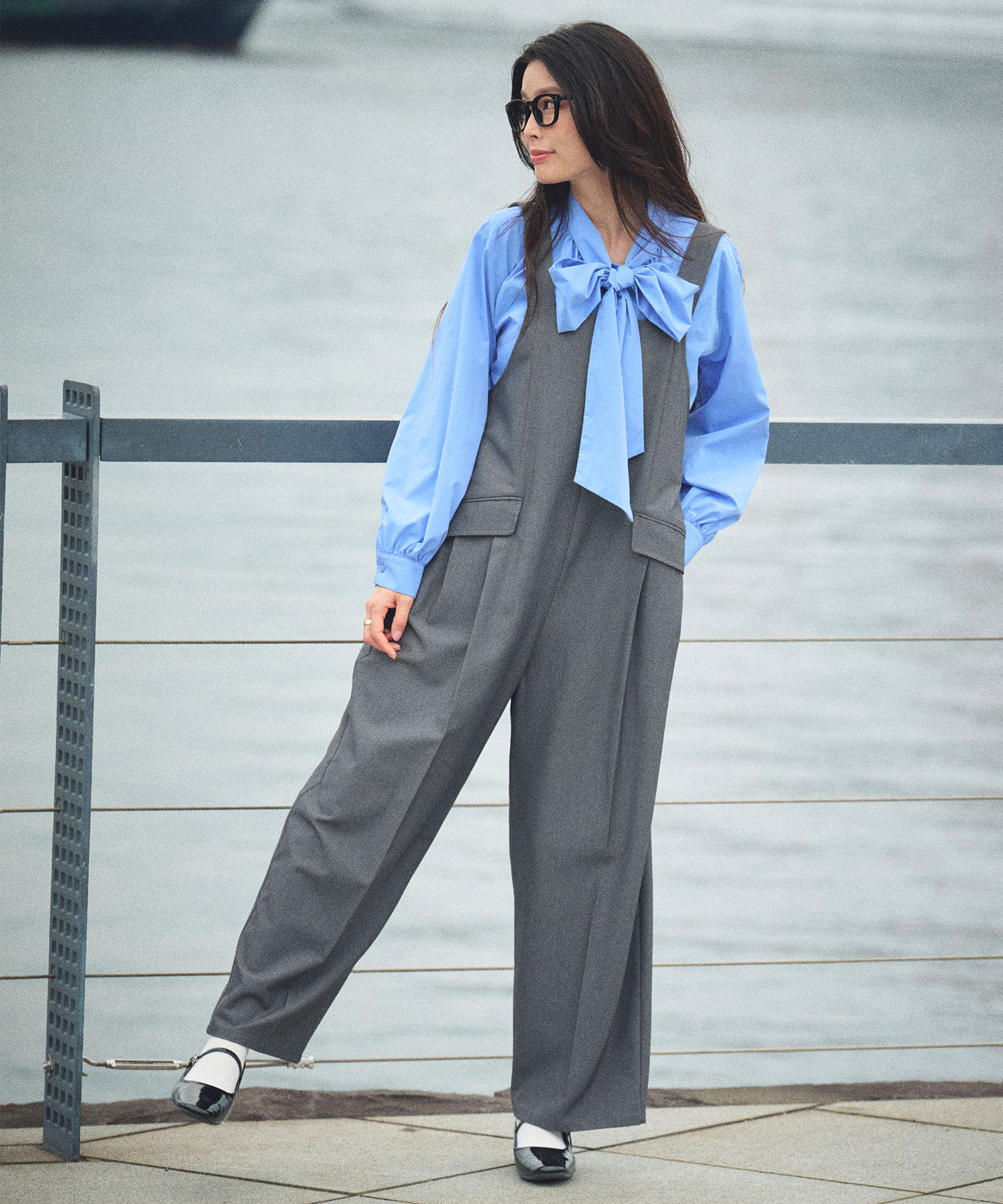 シワになりにくい素材を使用したオールインワンは、1枚で旬のバランスが完成する優秀アイテム。ブラウスを合わせるだけできちんと見えが生まれ、ハレの日にも活躍します。