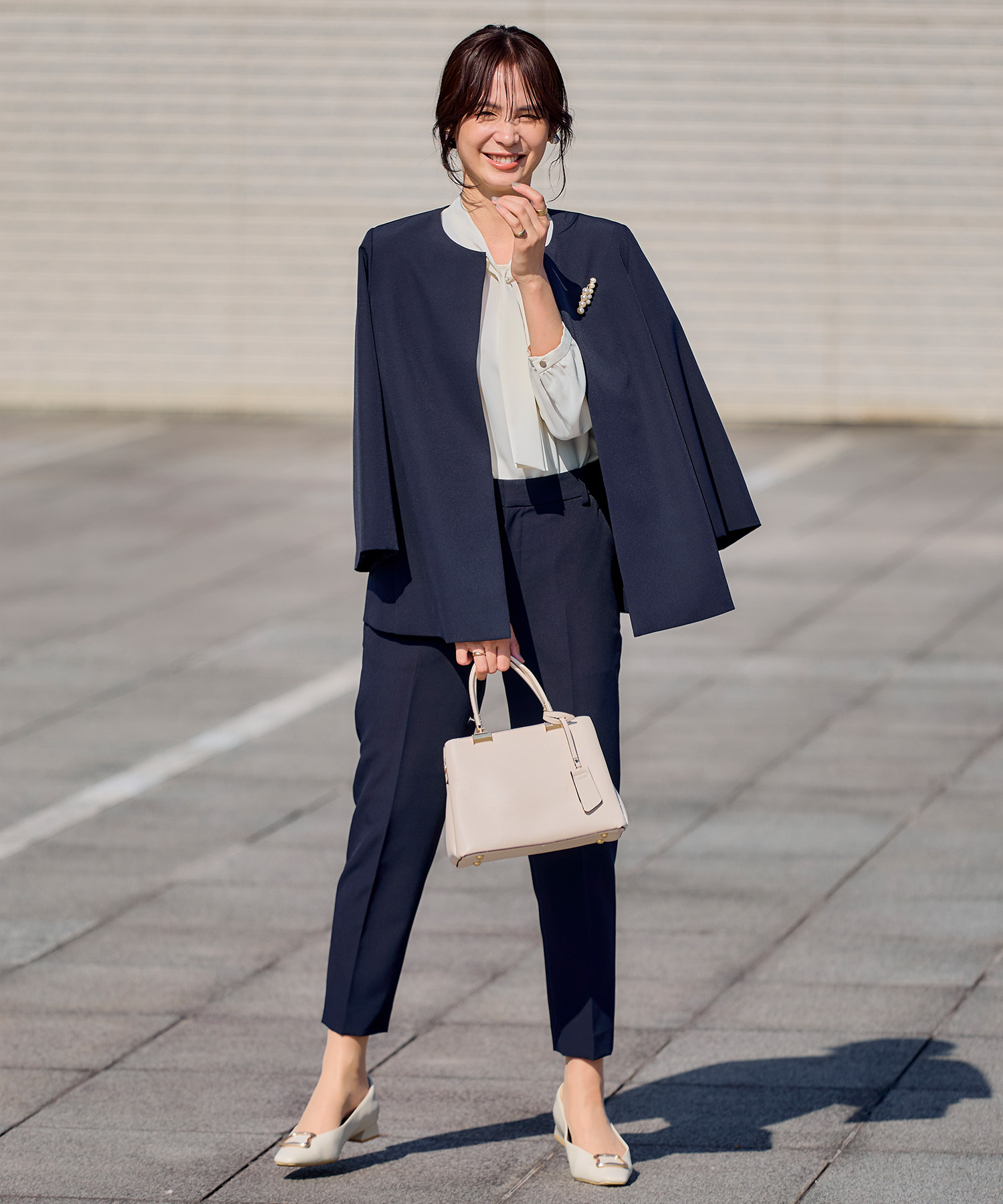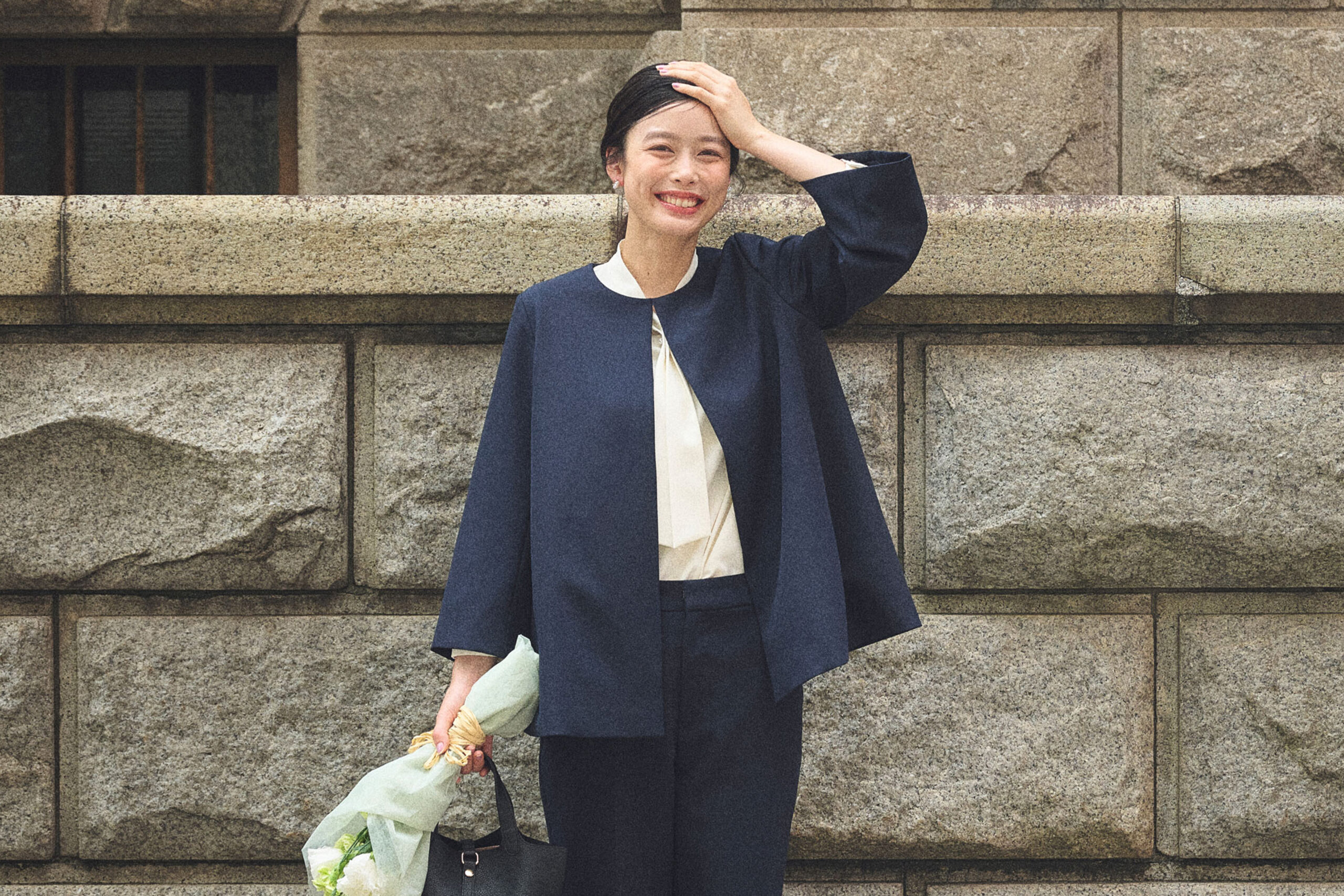 白アウターを羽織ること、ネイビーのセットアップがぐっと明るい印象に。やわらかなAラインが体をふんわり包み、緊張しやすいシーンでも優しい雰囲気に。軽やかな着心地で動きやすく、ハレの日の“きちんと見せたい”気持ちに寄り添います。