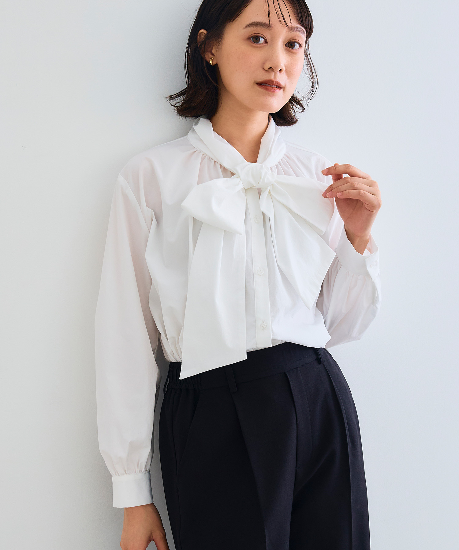 大きめのリボンデザインがセレモニーらしい華やかさで、映える仕上がりに。上品さと存在感を両立し、一枚で印象を格上げしてくれる、ハレの日の主役級ブラウスです。