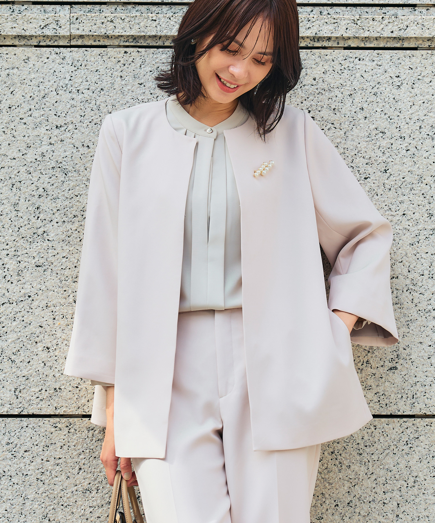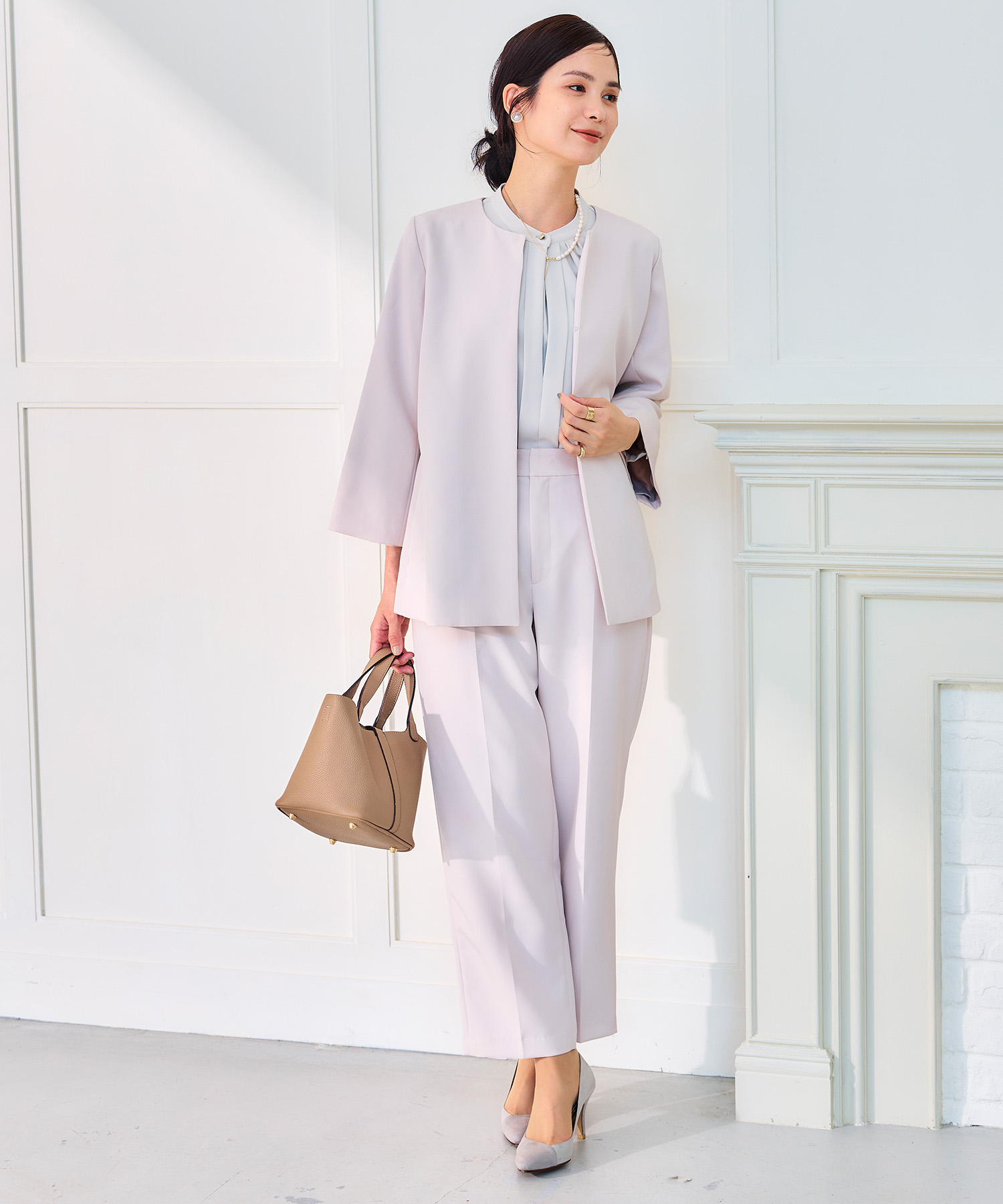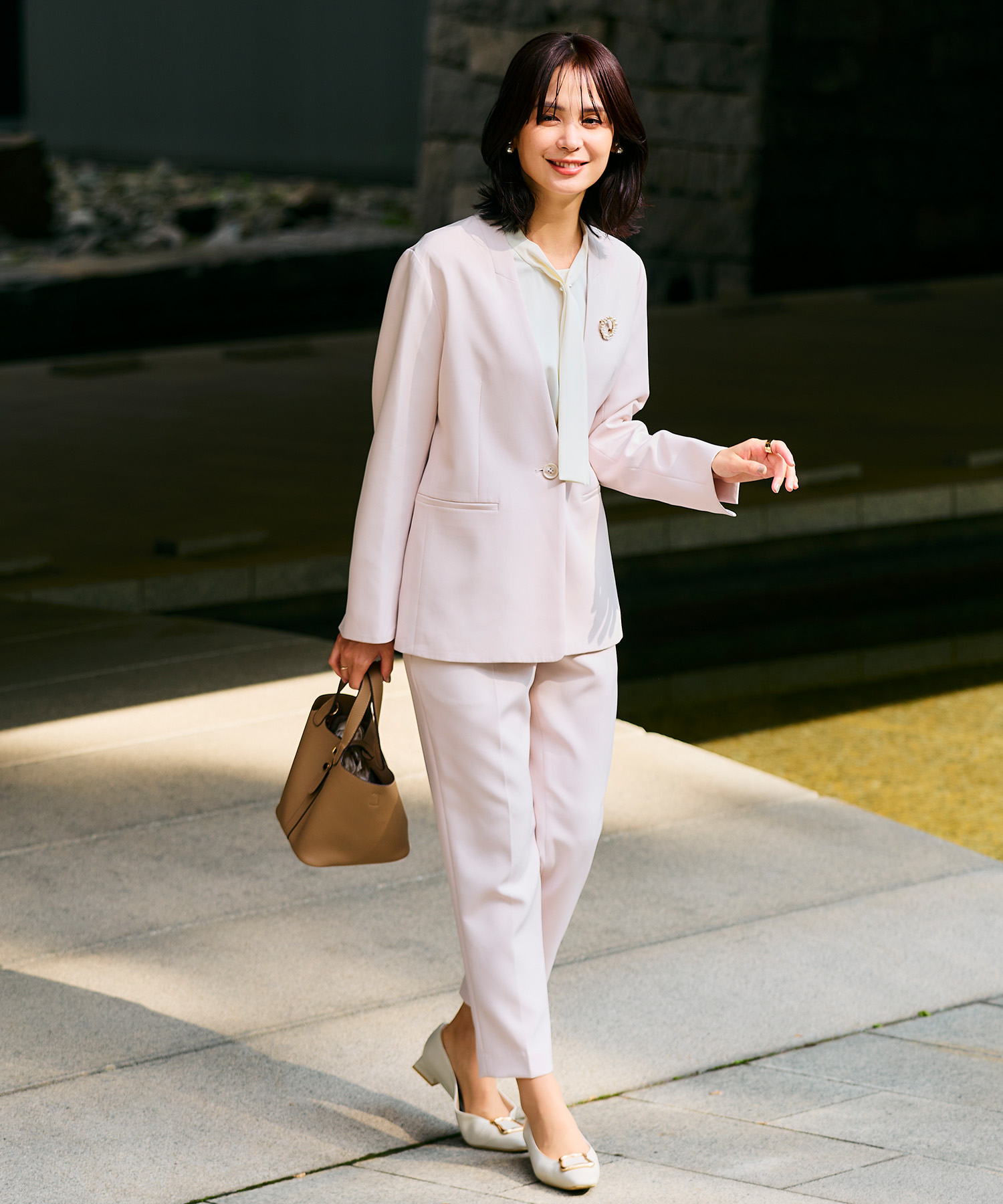 淡いトーンのセットアップは、明るく柔らかな雰囲気をまとえ、ハレの日の場を優しく彩ってくれる存在。程よく張りのある素材感がシルエットをきれいに見せ、端正さを保ってくれます。