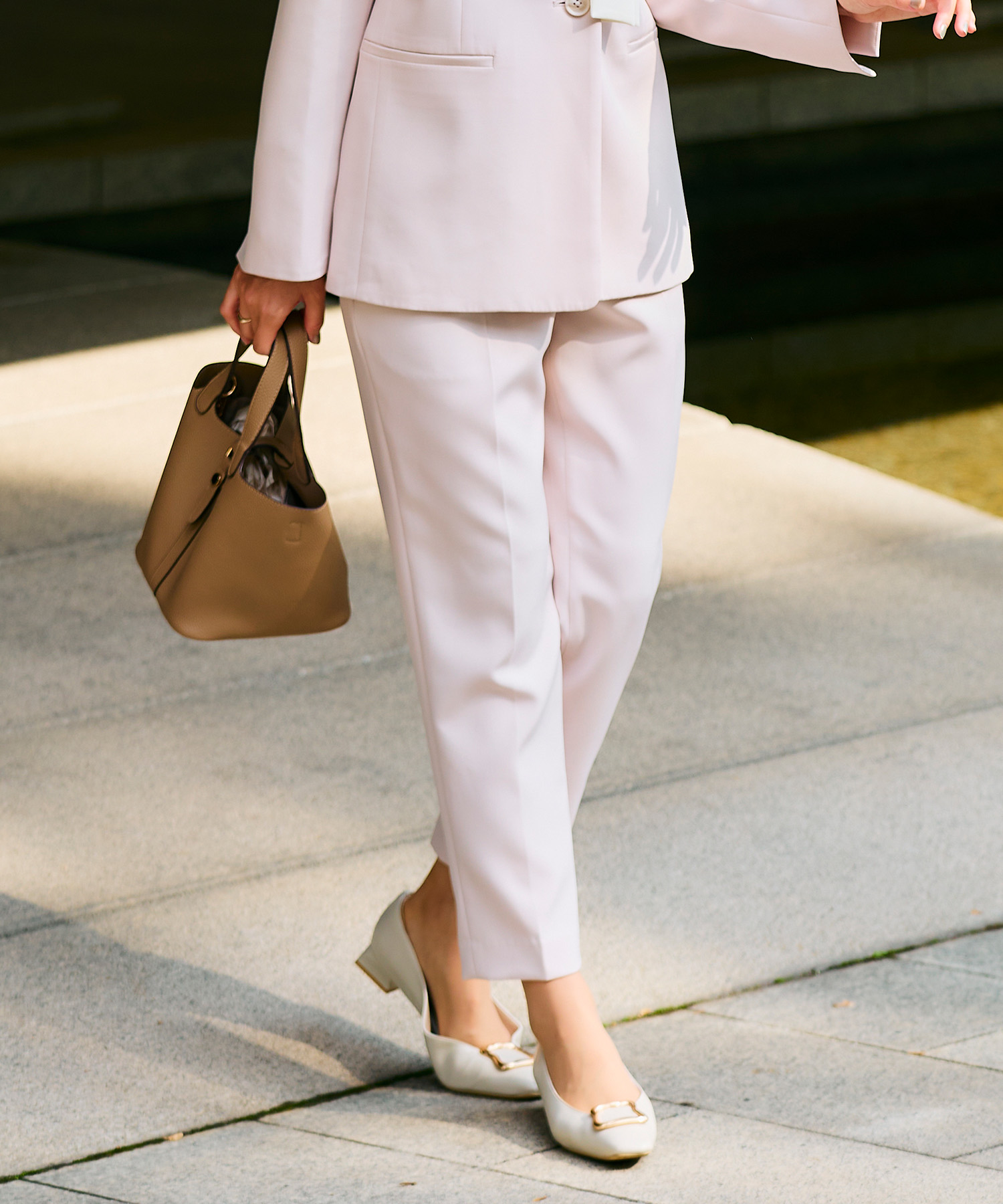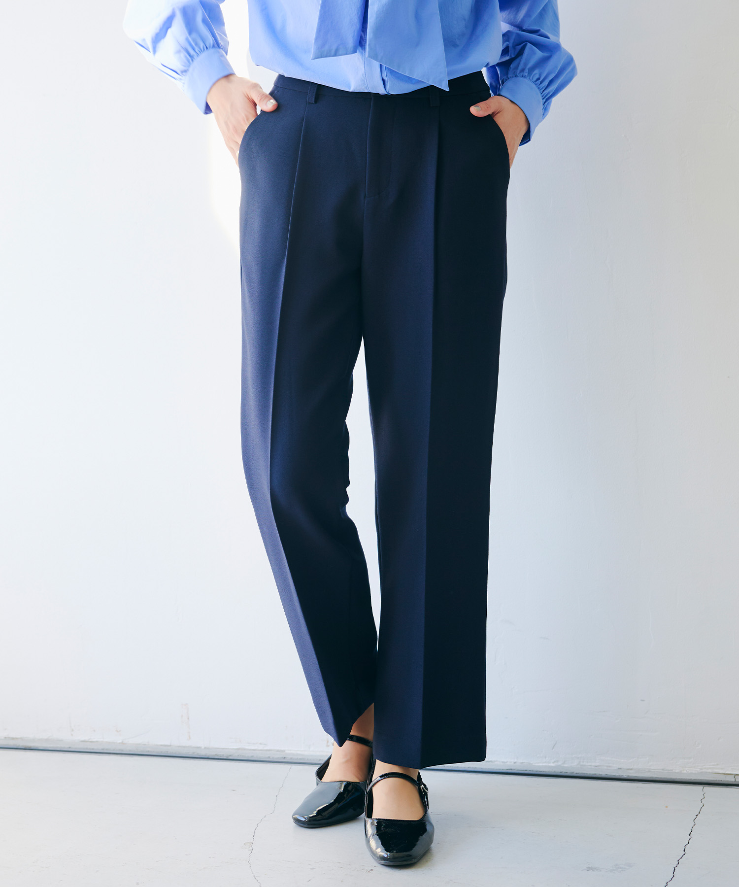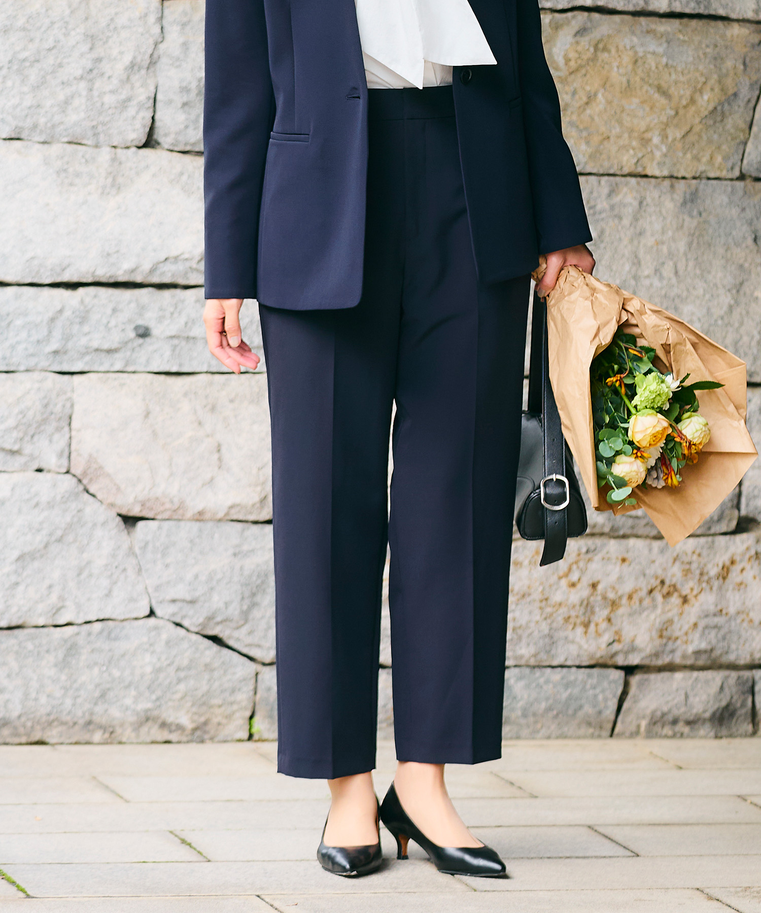 ほどよい細さとセンタープレスで、脚をすっきり見せてくれる美脚パンツ。足首がのぞく絶妙な丈感で、パンプス合わせもきれいに決まり、ハレの日のスタイルアップが叶います。
