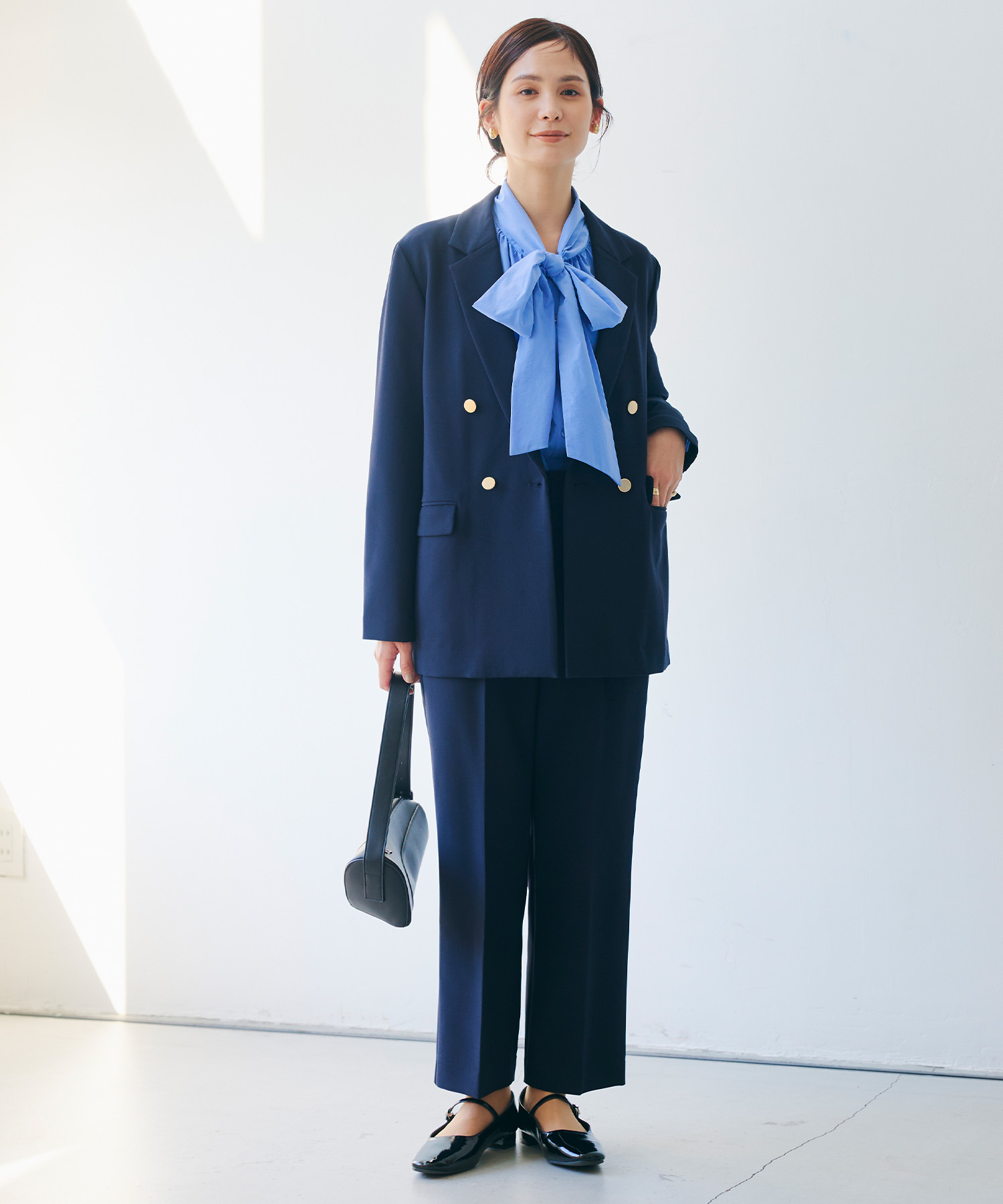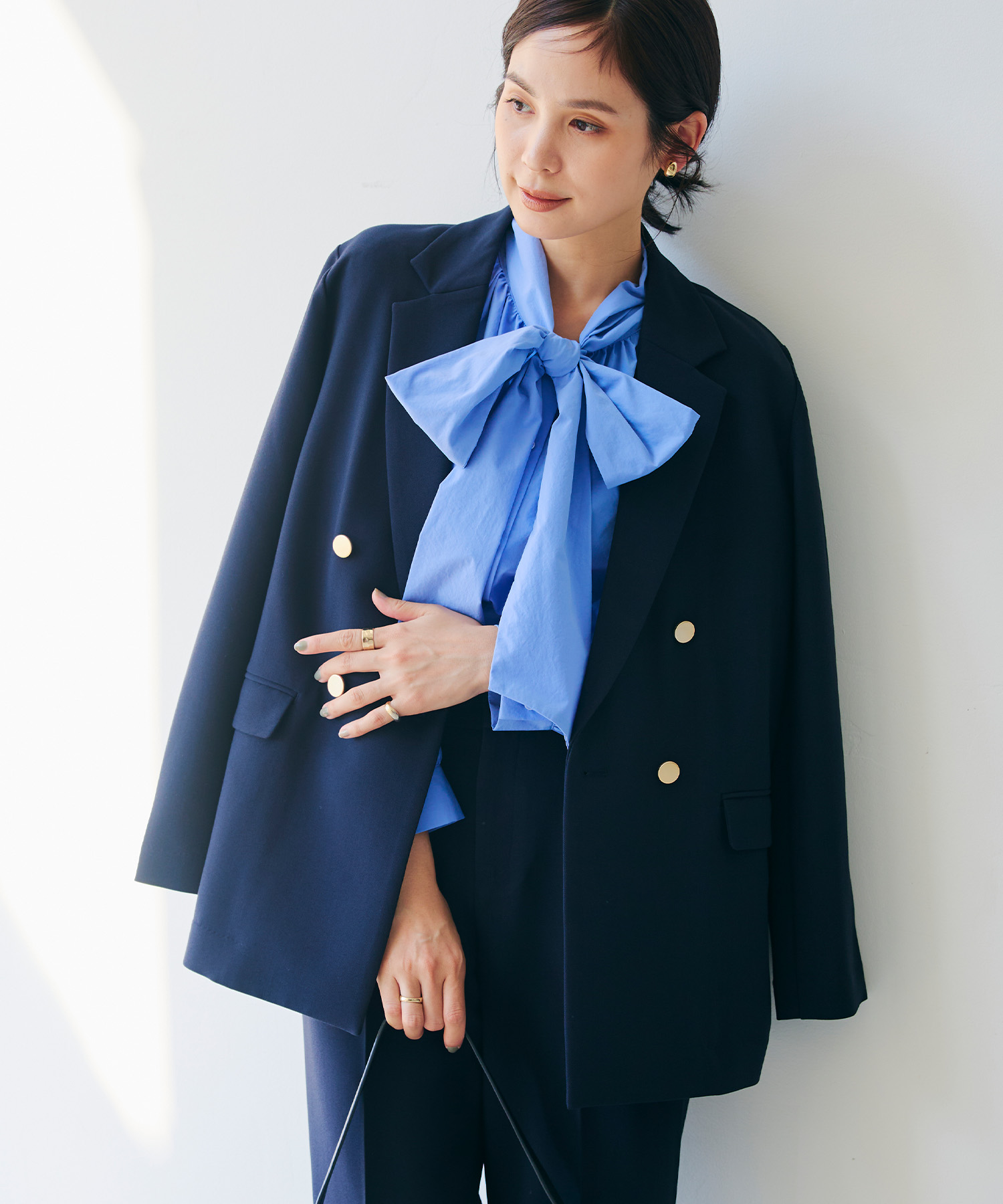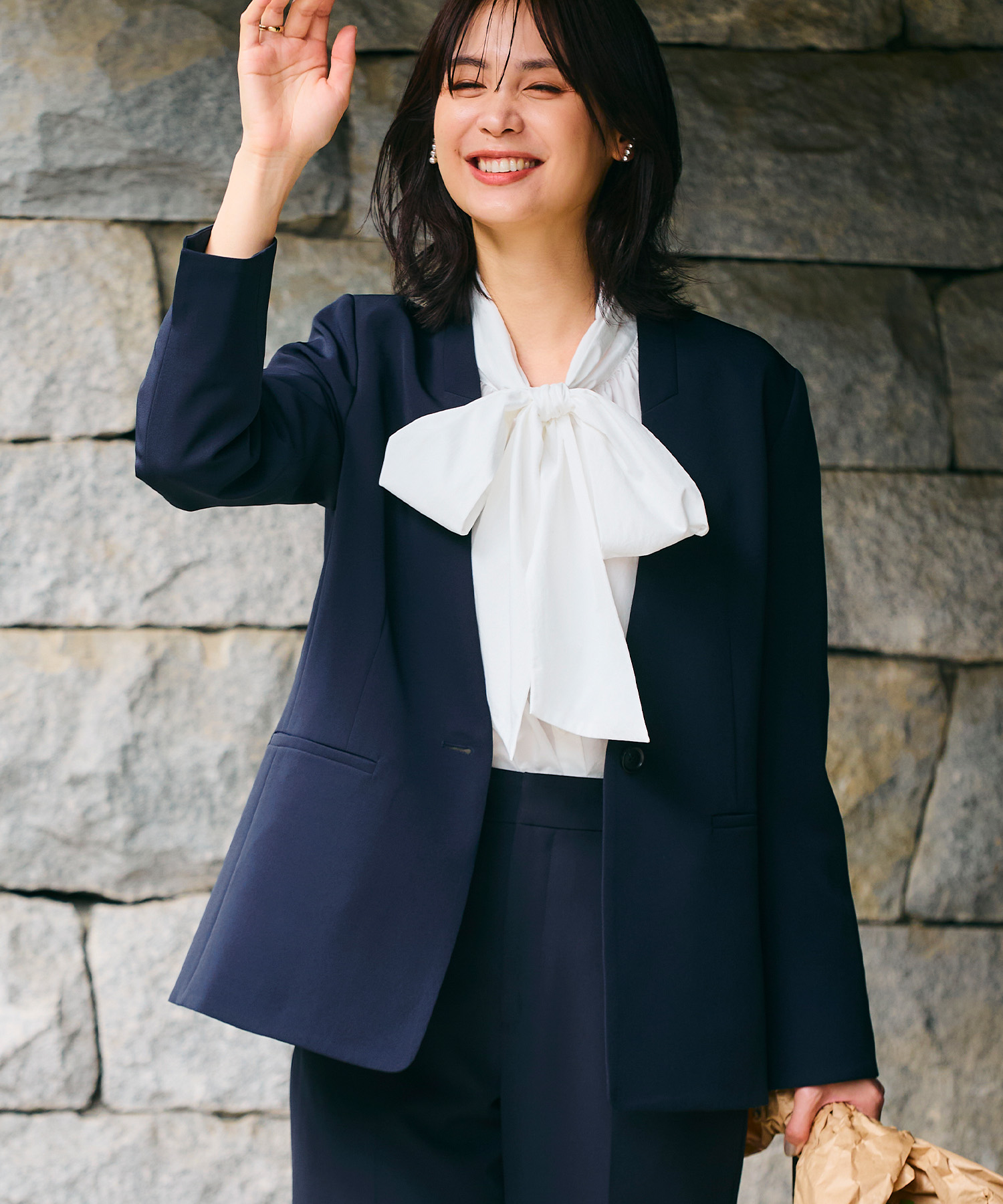 鮮やかなボウタイがぱっと表情を明るくし、ダブルジャケットのほどよい存在感が装いにメリハリを添えてくれます。ネイビーのセットアップは女性らしさがあり、洗練されたハレの日スタイルに仕上がります。