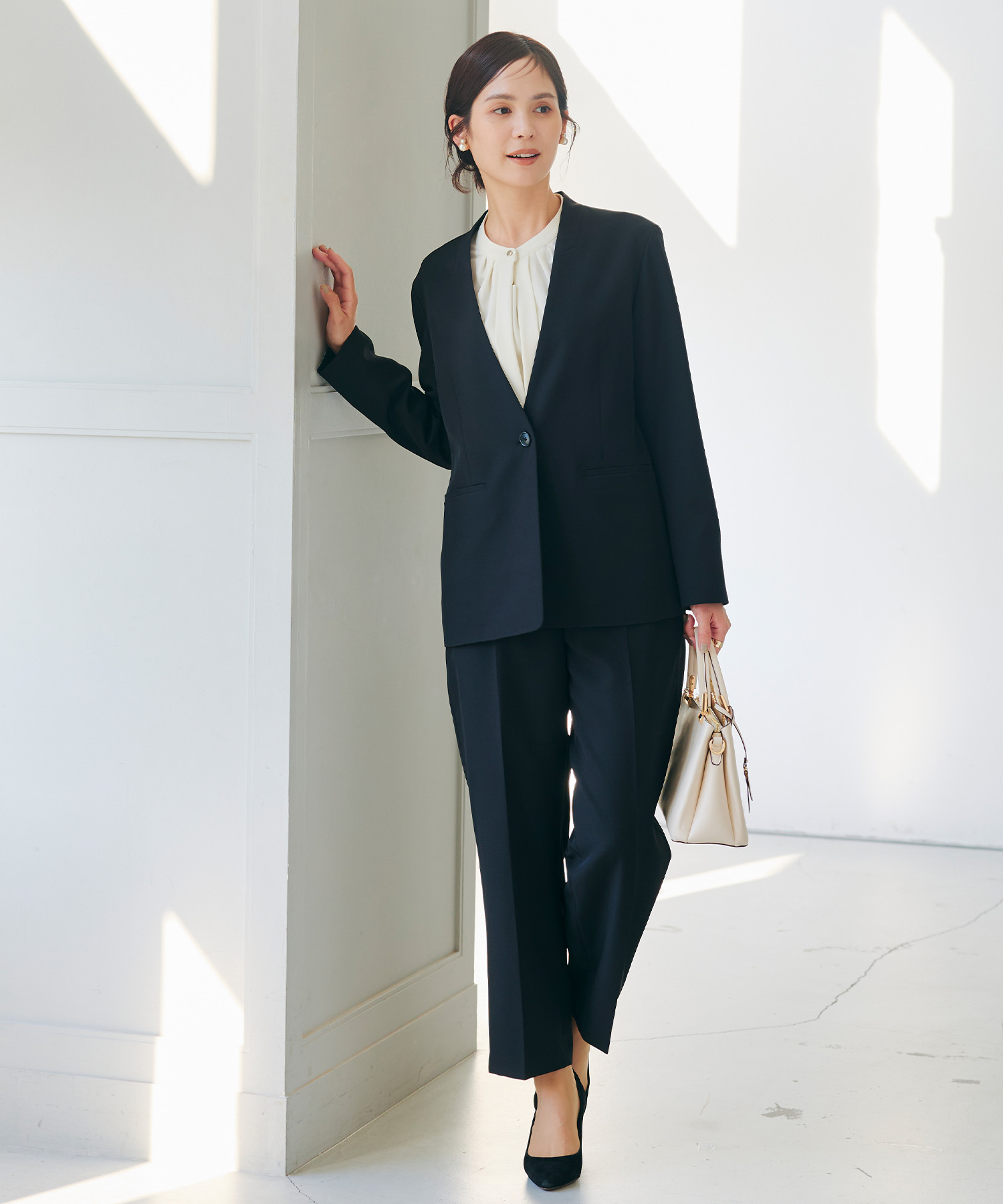 黒のセットアップは、一枚で全体をすっきりまとめてくれる頼れるアイテム。適度にゆとりのあるシルエットで緊張しやすい場面でも動きやすく、自然と姿勢が整うのも魅力です。シンプルながらも端正に決まり、大切な日のコーデを支えてくれます。