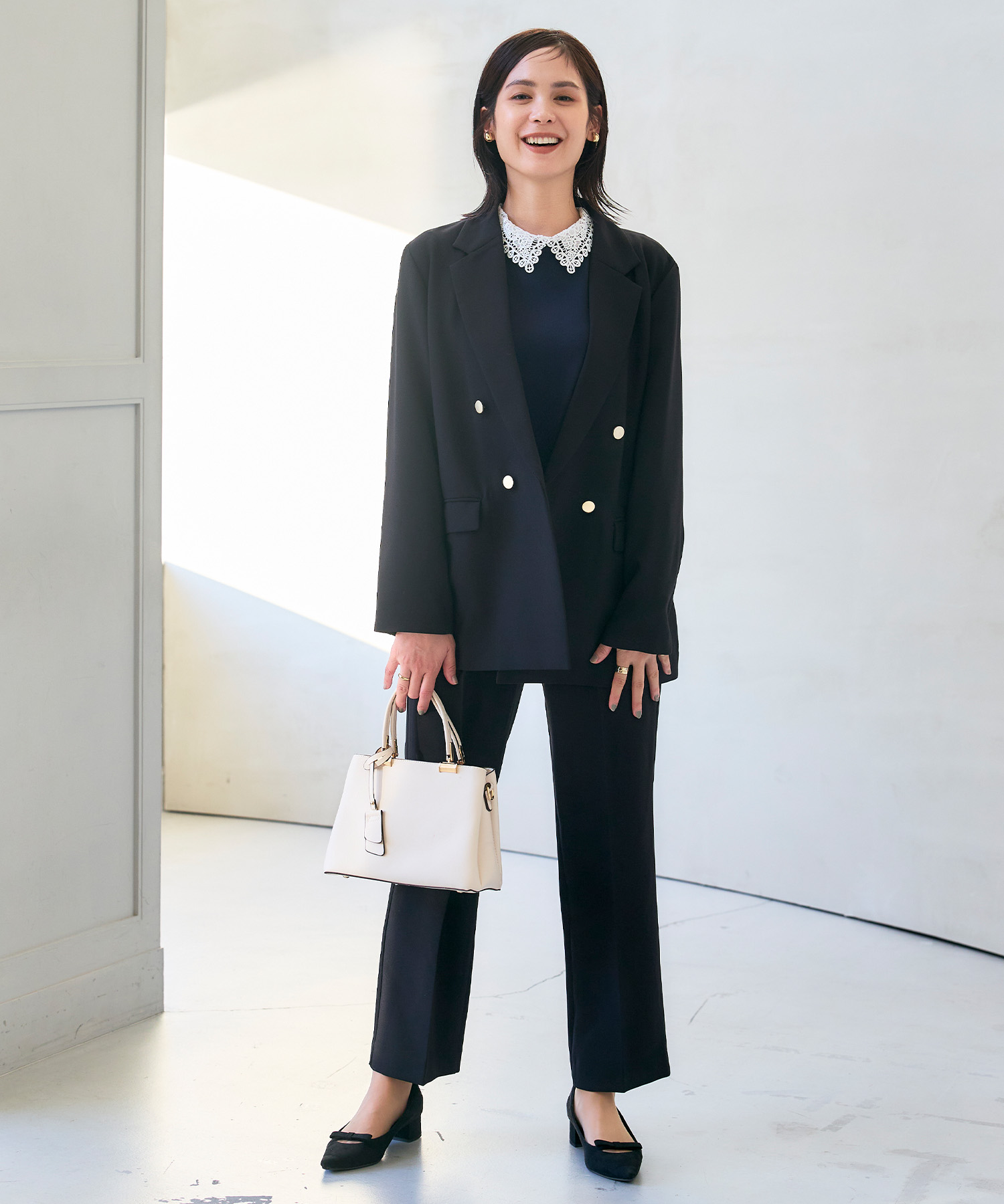 繊細なレース衿が優しいアクセントとなり、ダブルジャケットの端正さをほどよく和らげるハレの日コーデ。ブラックのセットアップは落ち着いた雰囲気で式典にふさわしい格式を演出してくれます。甘さときちんと感のバランスが両立したスタイルです。