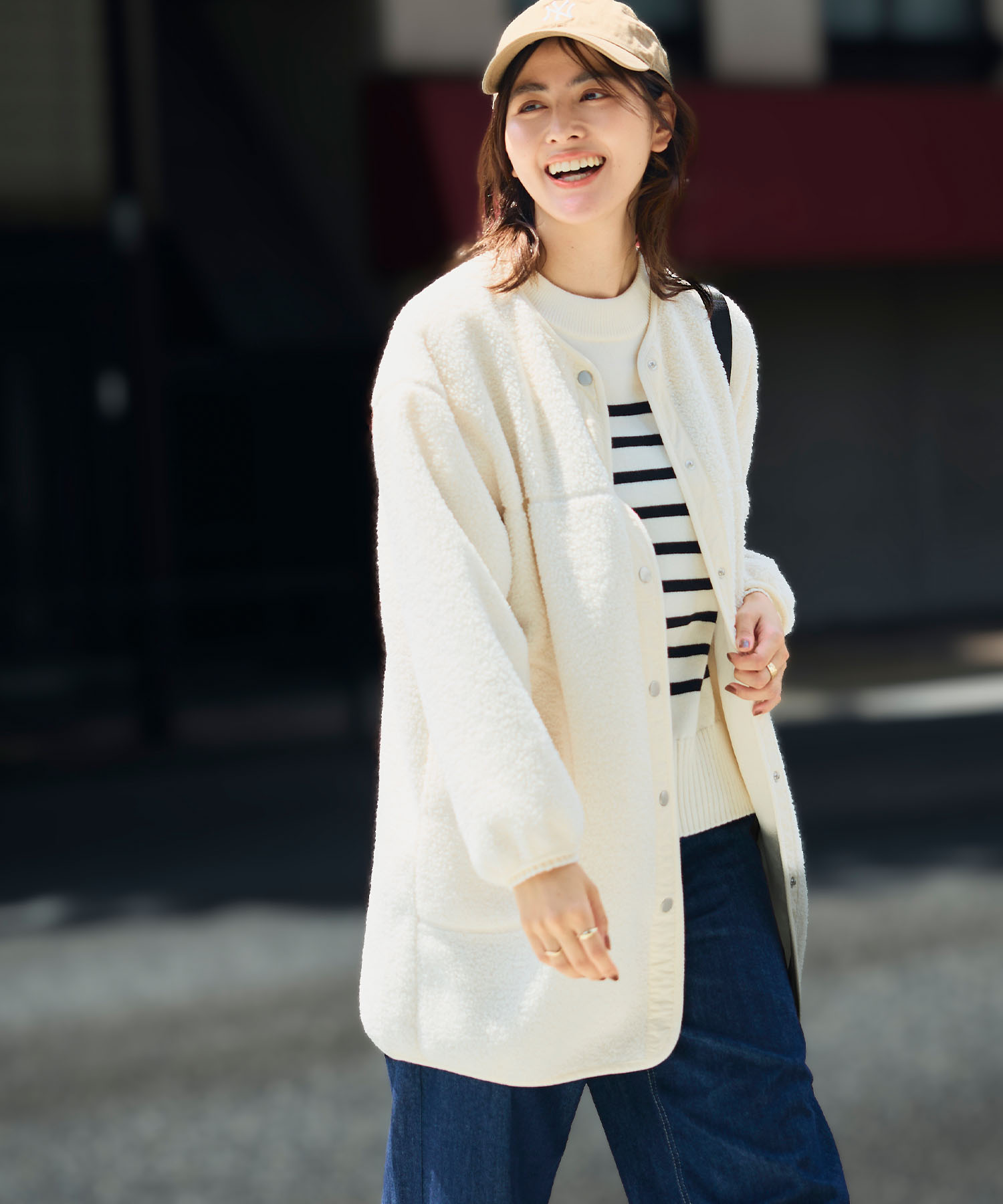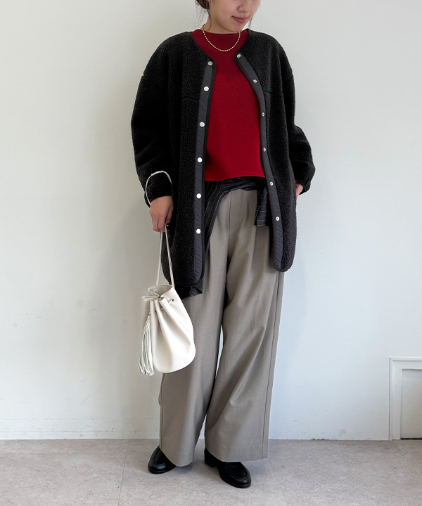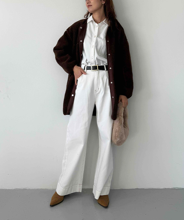 ボアアウターの暖かさと、オールホワイトの軽やかさが絶妙にマッチした、ホリデー感漂う旬コーデ。ブラウンの深みが白を引き立て、冬らしいメリハリが生まれます。シャツ×ワイドパンツのきれいめベースに、アウターを重ねるだけで季節感がプラスされ、最高気温11度の装いを盛り上げます。