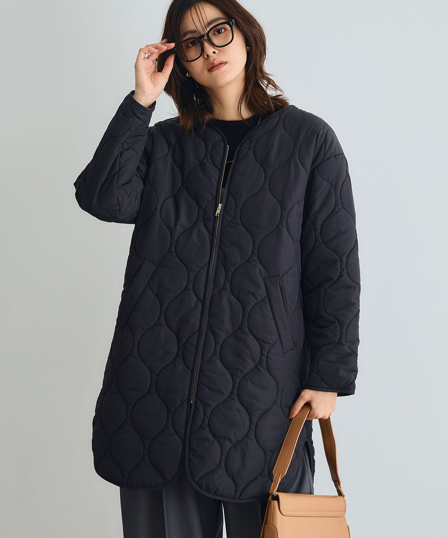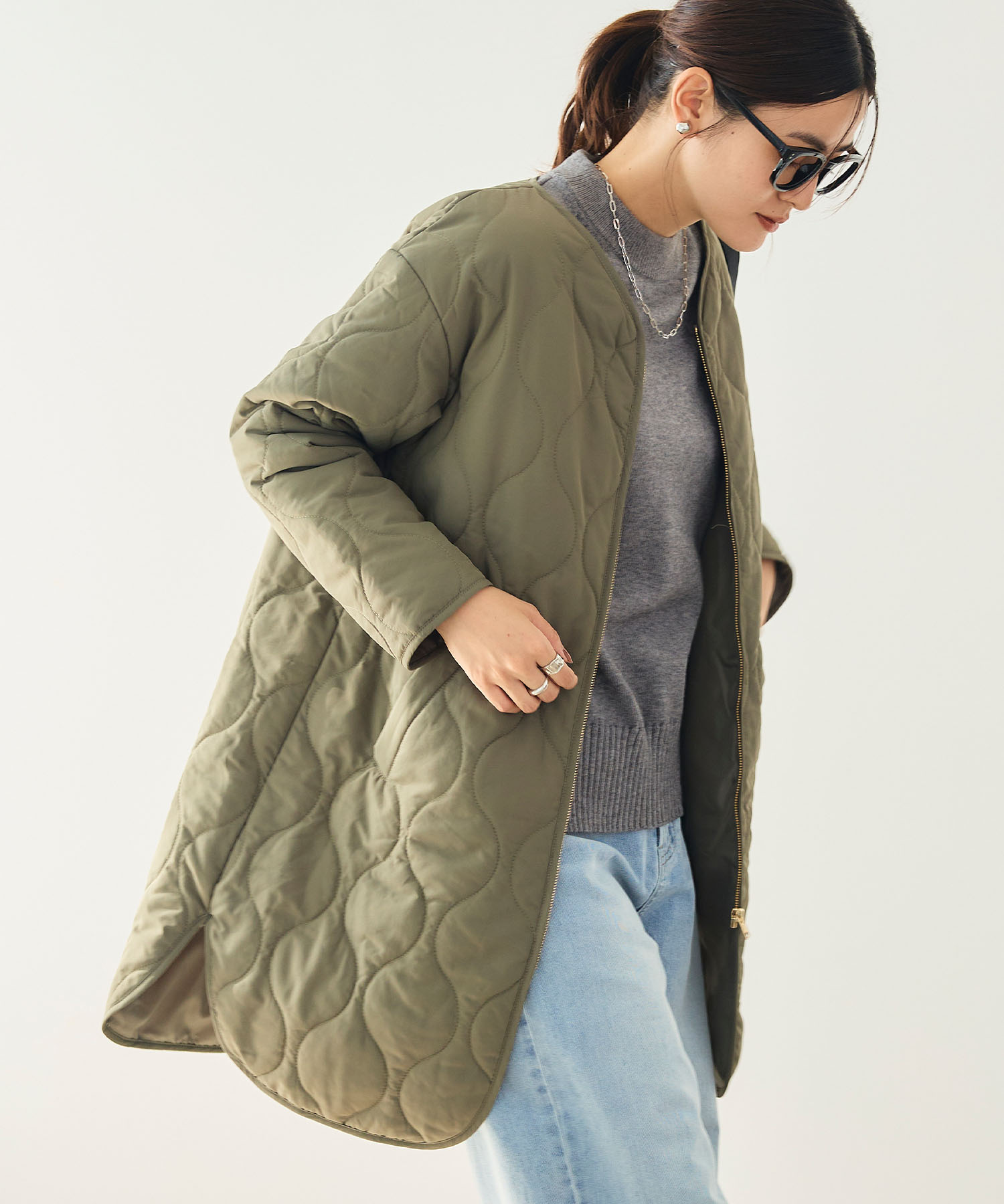 軽さと暖かさを兼ね備えたキルティングコート。中わた入りでしっかり保温できるのに重たくならず、デイリーに取り入れやすいのが魅力です。長め丈がほどよく保温効果も期待できる、ひんやりとした日も快適に過ごせます。
