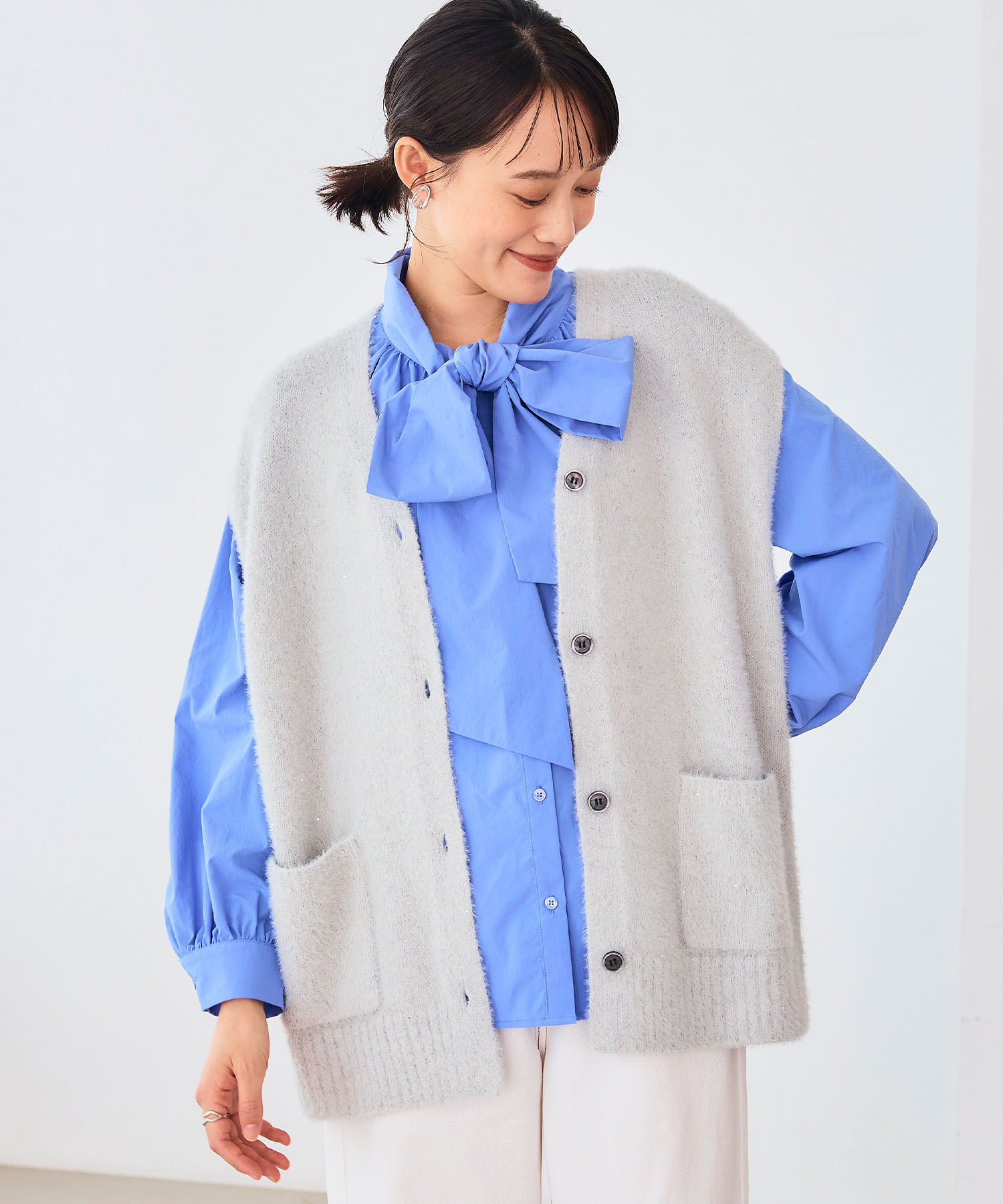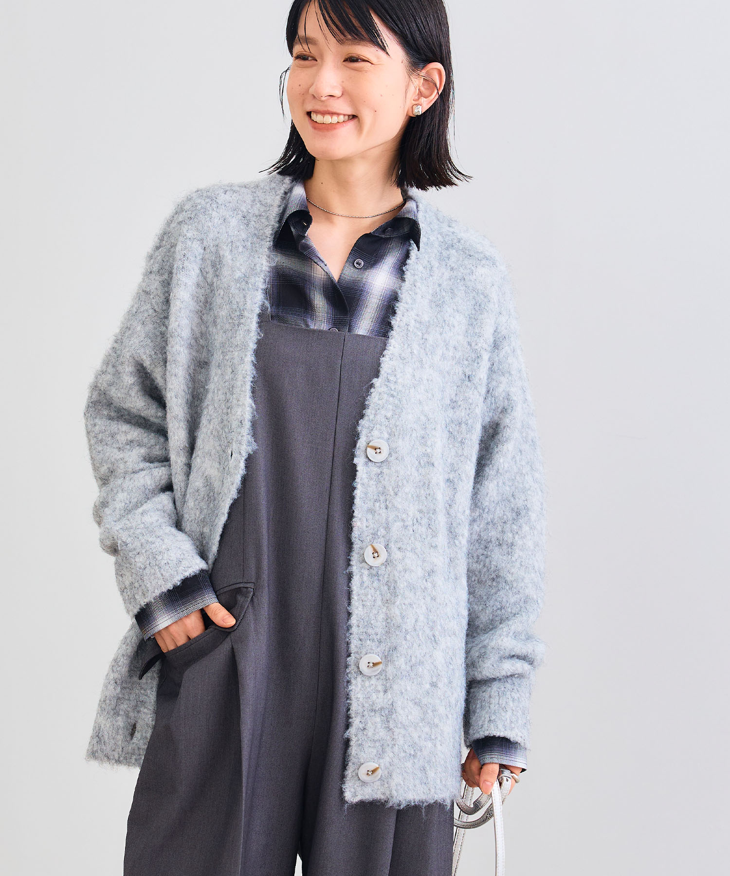 軽い着心地ながらパッと華やぐデザインで、コーデの主役にもなる一枚。ファーポケットが柔らかな印象をつくり、いつもの装いに“旬のムード”を添えてくれる着映えカーディガンです。