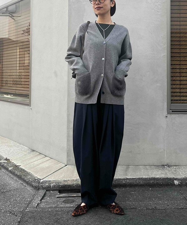 最低気温11度の冷たさに寄り添うポケットファーが魅力のカーディガンは軽やかに羽織れ、黒のワイドパンツを合わせれば、落ち着いた雰囲気に。シンプルな配色でもトレンドのコクーンシルエットで立体感が生まれ、日常に気分を上げてくれる旬なスタイリングです。
