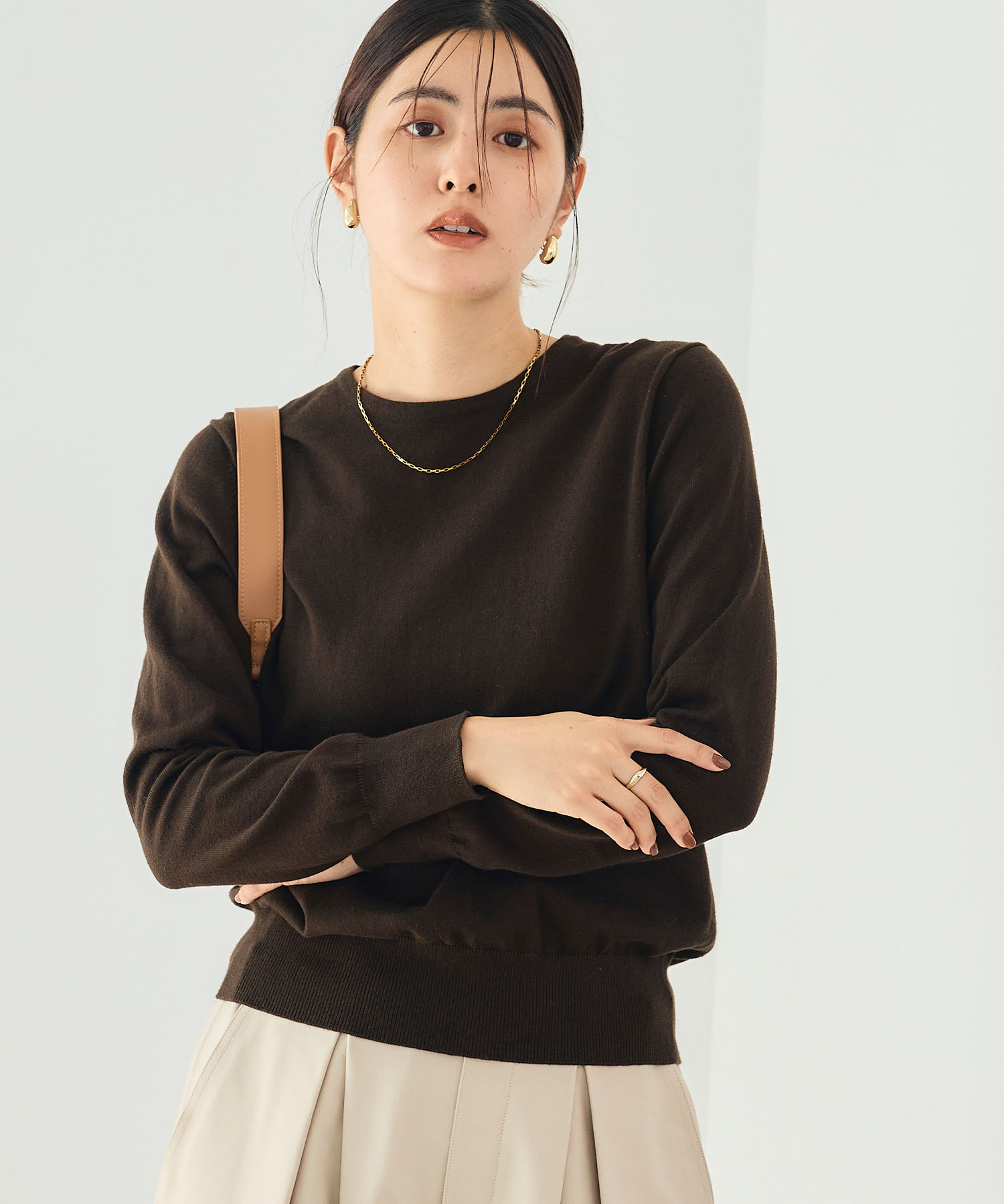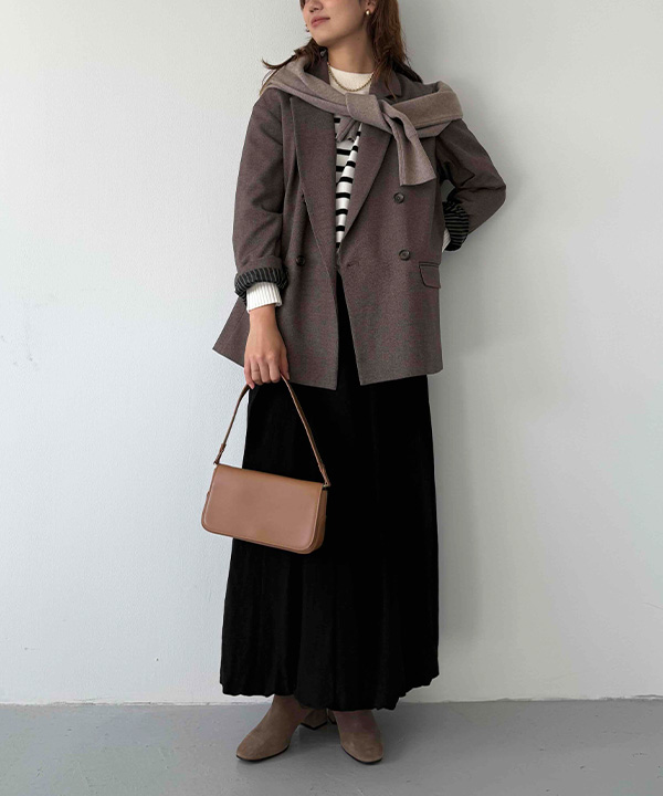 朝晩は冷えを感じつつ、日中は軽やかに過ごせる最高気温12度の日にちょうどいいのが、ジャコットを主役にしたレイヤードスタイル。インナーに薄手トップスを合わせ、ニットを肩掛けすることで温度調整も◎。ロングスカートの落ち感が重たさを抑え、きれいめとリラックス感を両立。通勤から外出まで幅広く活躍します。