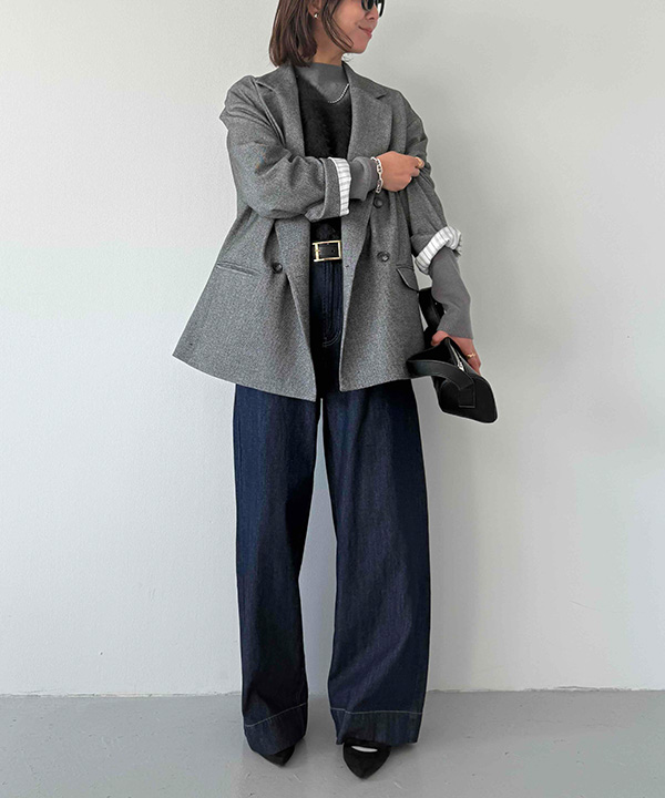最高気温12度の日は、アウターに頼りすぎず、全体の素材感で暖かさをつくるのがポイント。ウールライクのジャコットは程よい厚みがありながらも軽やかな着心地で、フェザーベストがレイヤードされたニットを合わせることで体温調整もスムーズに。ワイドデニムのボリューム感が今っぽさを演出し、軽快な印象に仕上がります。