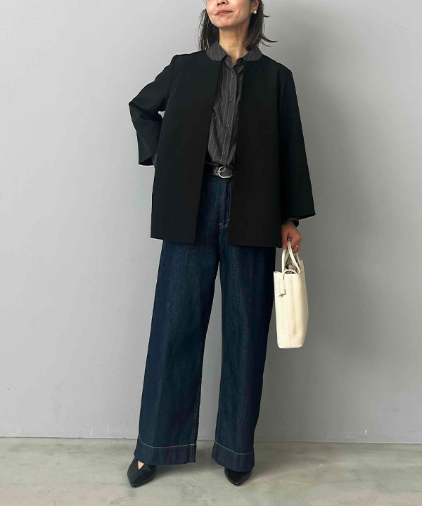 最低気温12度の日は、アウターで冷えを防ぎつつ中は軽めにまとめるのが正解。ダブルクロス素材のきちんと感あるジャケットは、程よいフレアシルエットで羽織るだけでコーデ全体を引き締め、デニム合わせでカジュアルダウンすことで、かたくなりすぎず大人の抜け感を演出。朝から夜まで安心して過ごせる実用的なコーデです。