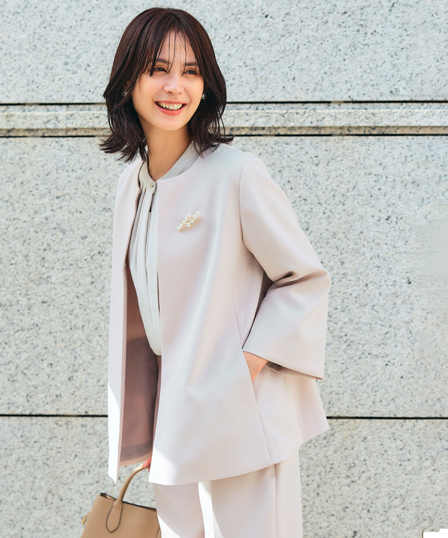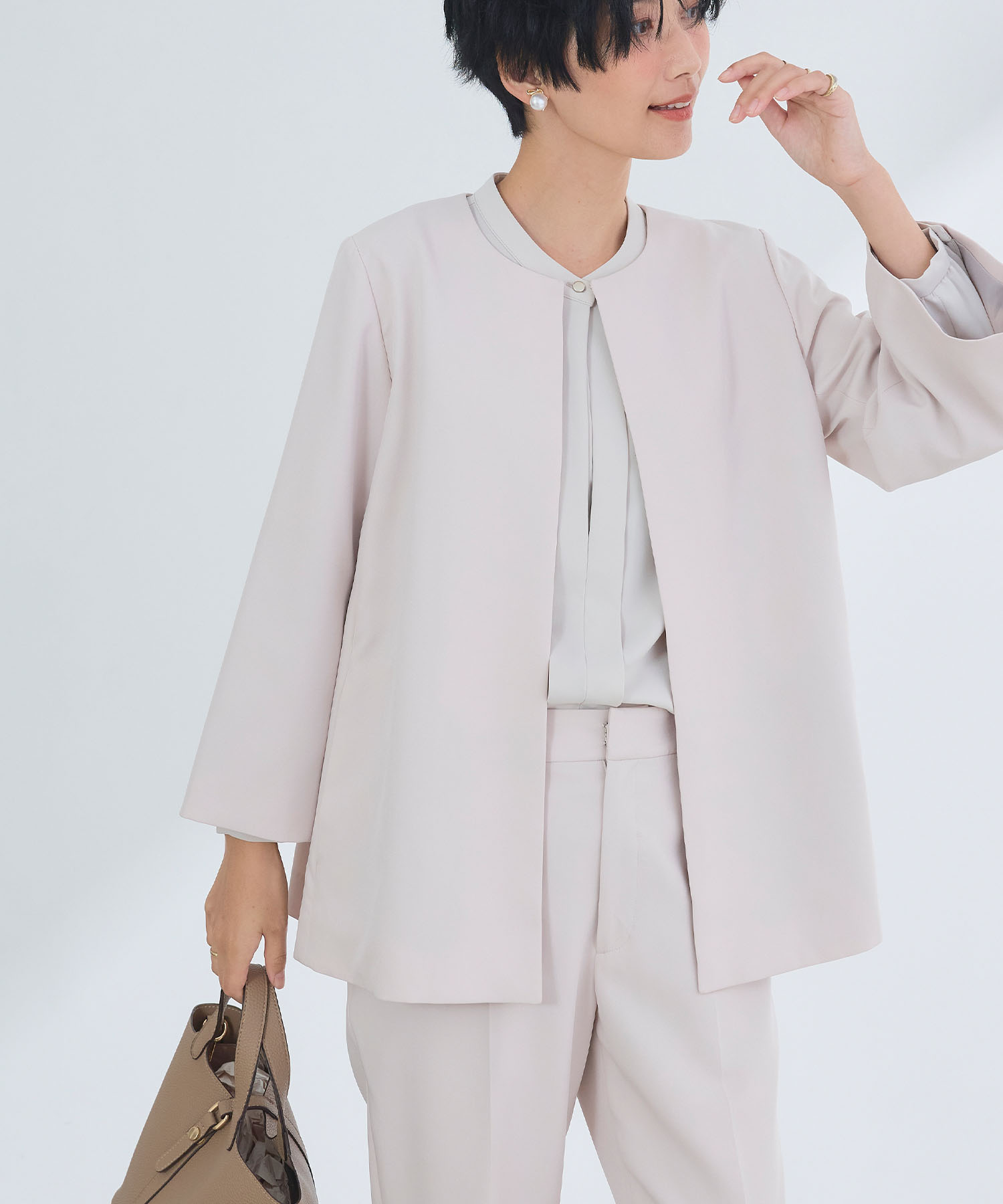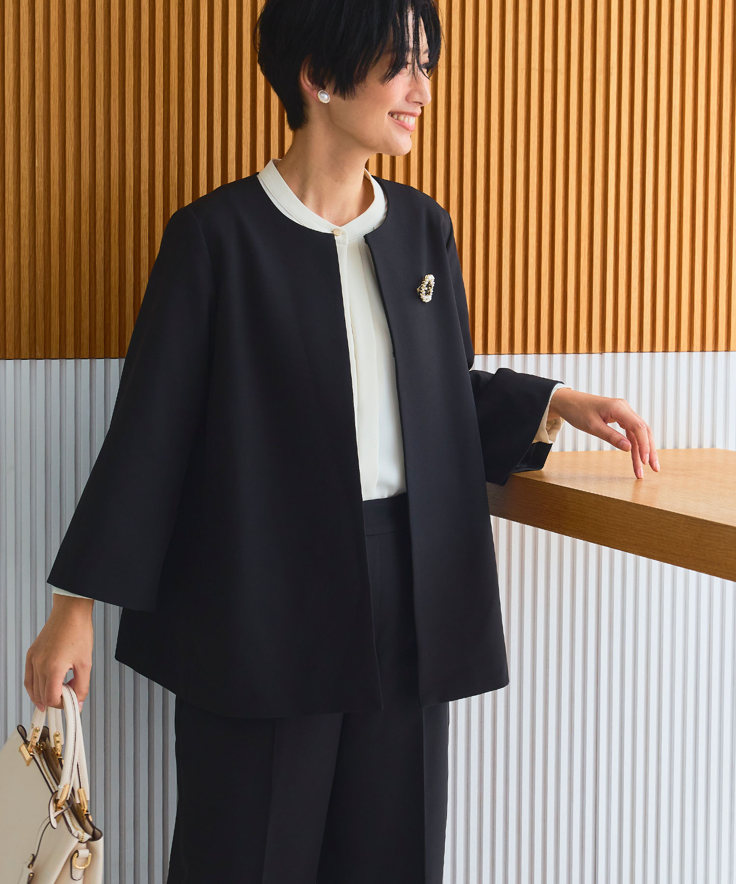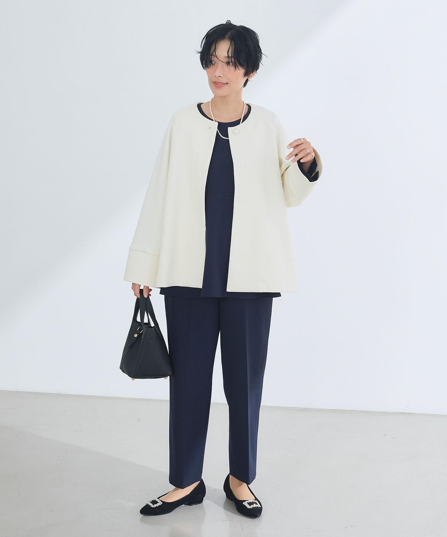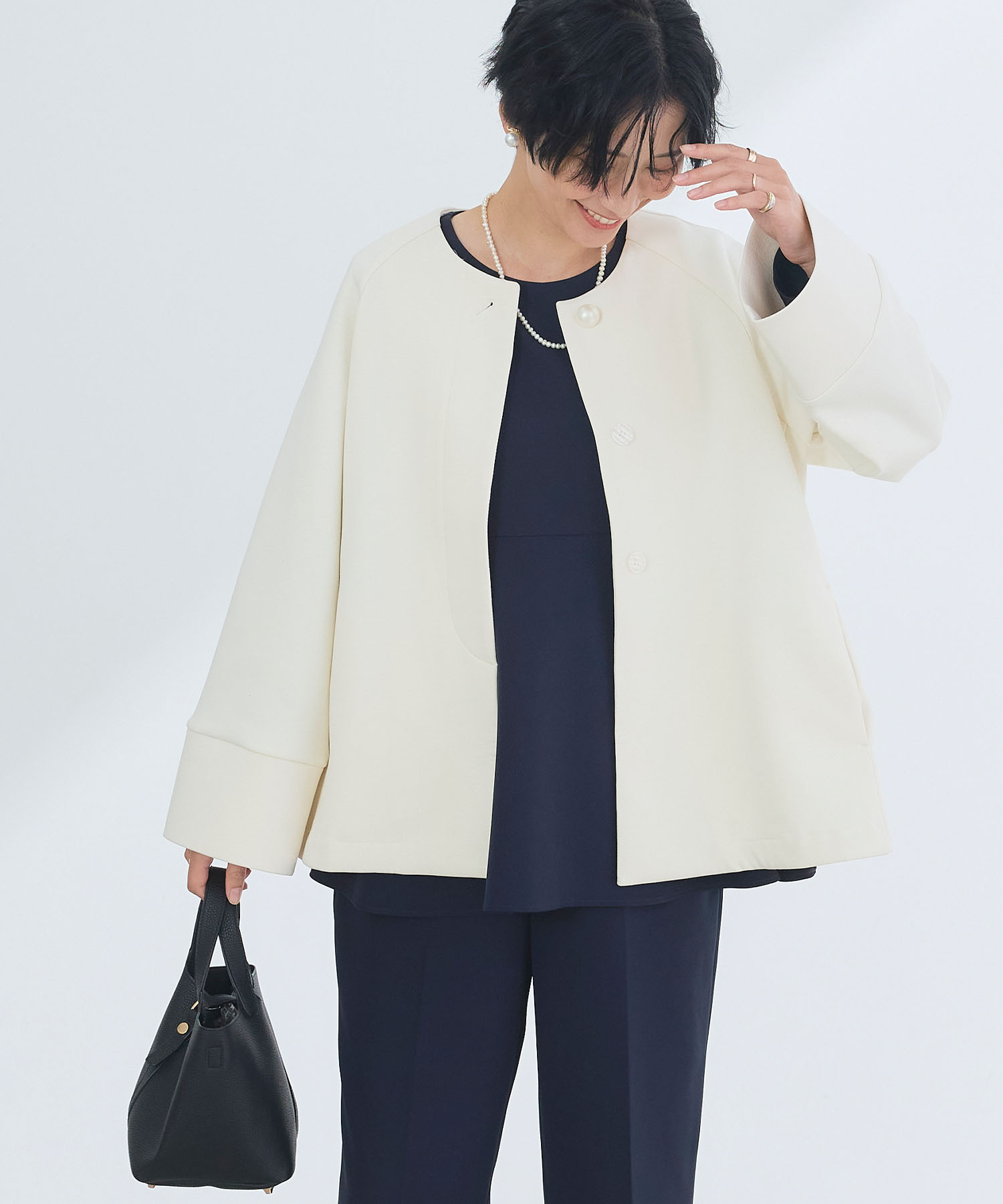 朝の外気に少し冷たさを感じる最低気温12度の日は、軽く羽織れるアウターが活躍。ノーカラーコートは首元をすっきり見せつつ、インナーで温度調整しやすいのが魅力です。ゆったりとしたトップスに細身パンツを合わせることで、動きやすさと上品さを両立。ハレの日から通勤まで対応できる、端正なバランスの装いです。