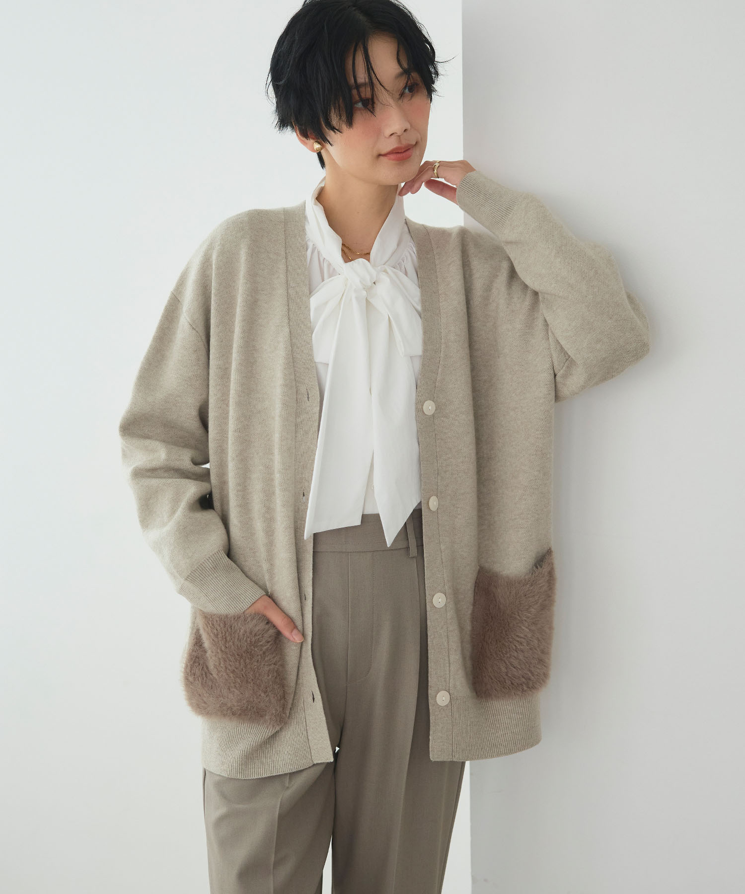 ゆとりのあるシルエットで重ね着しやすく、冷えを感じやすい時間帯も快適に。異素材の切り替えがコーディネートに奥行きを生み、シンプルな装いでも表情豊かに仕上がります。