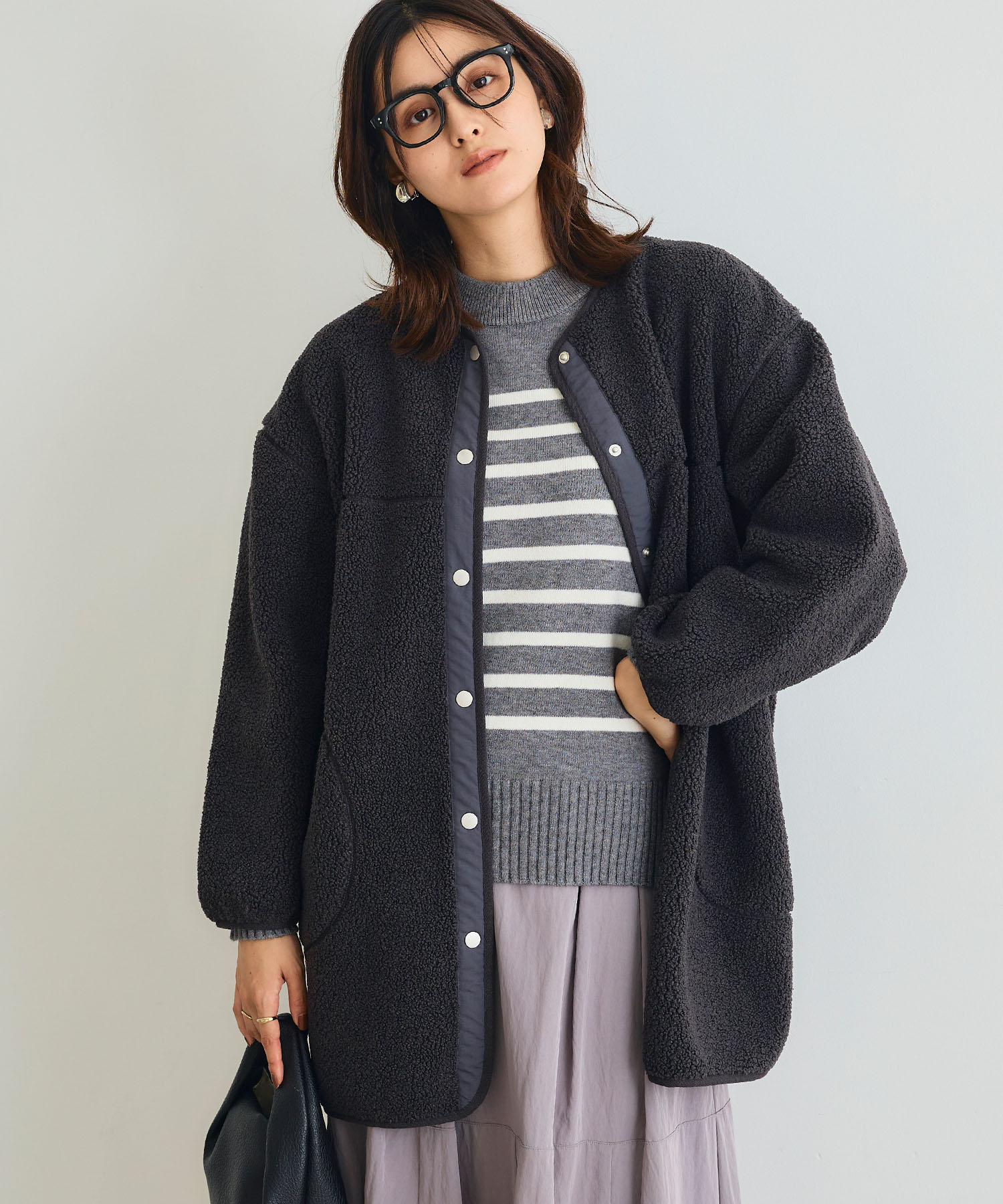 最高気温12度の日は、防寒しすぎず軽快さを残した服装が理想。ボアコートは見た目以上に軽く、さっと羽織るだけで暖かさを確保できます。インナーはシンプルにまとめることで、ボリューム感もバランスよく調整可能。デニム合わせで程よくカジュアルダウンすれば、気負わず着られる大人のデイリーコーデが完成します。
