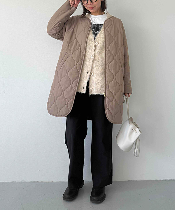 中綿入りのキルティングコートは、程よい保温性で暖かさをキープしながらも重たく見えないのが魅力です。カジュアルな日常にもきれいめ要素を添えてくれる、大人にちょうどいい一着です。