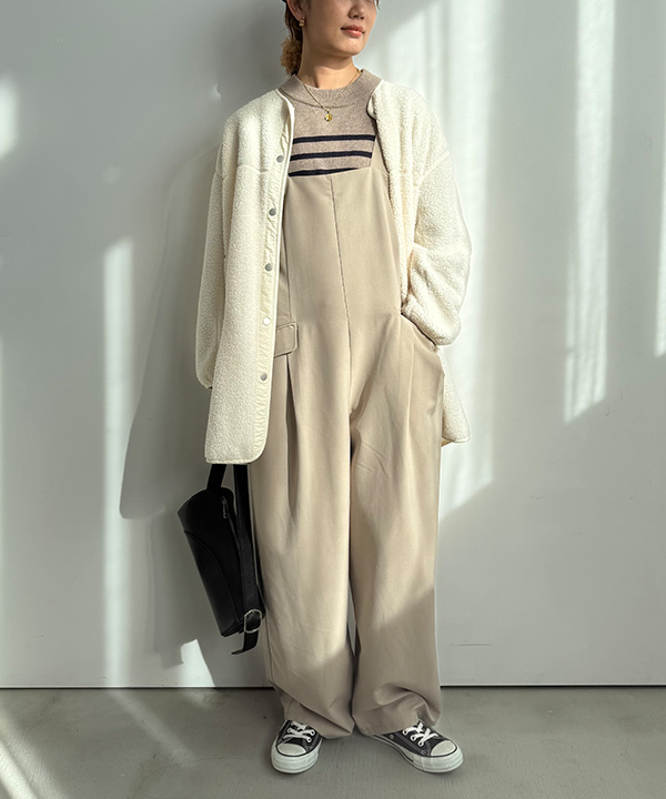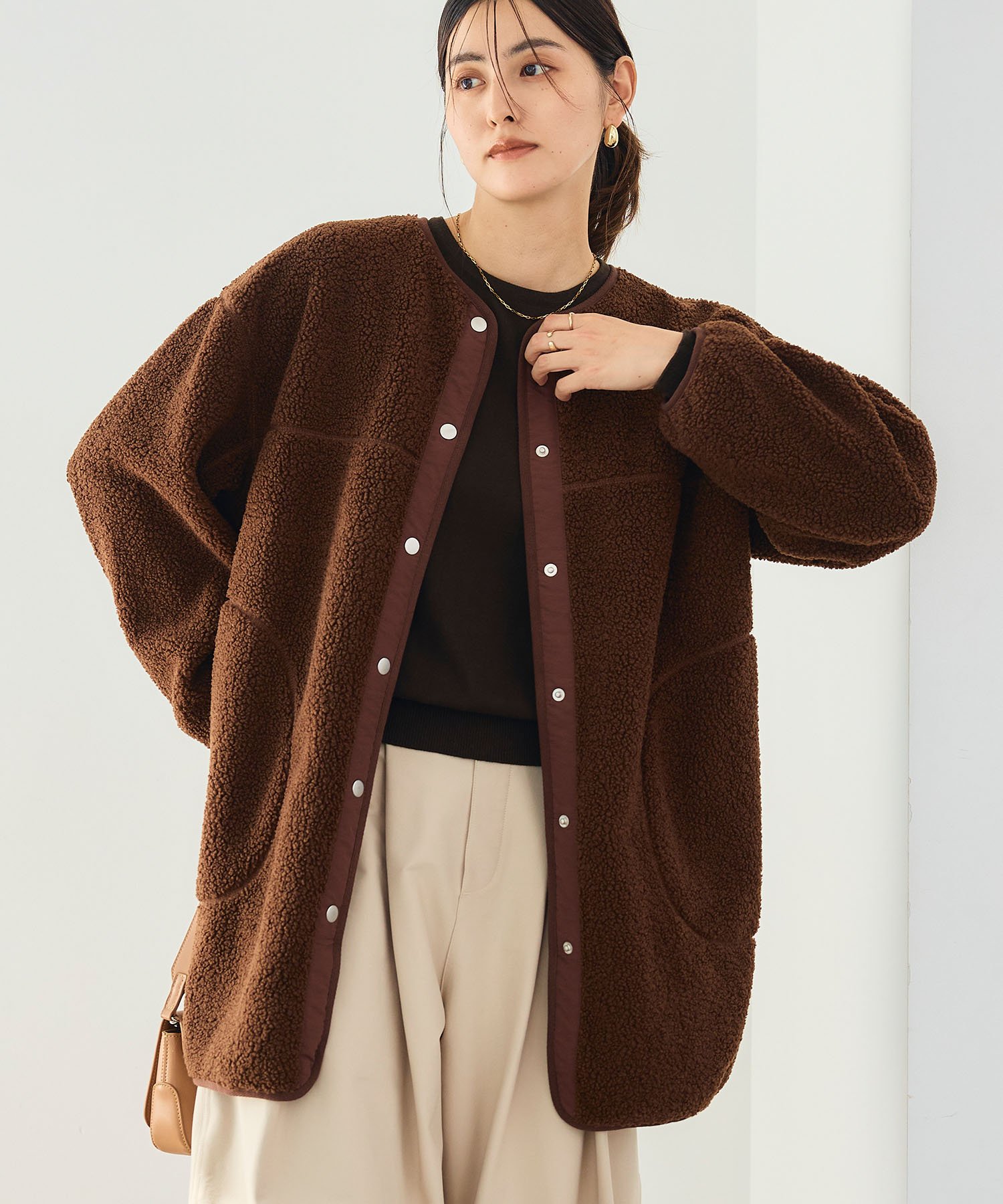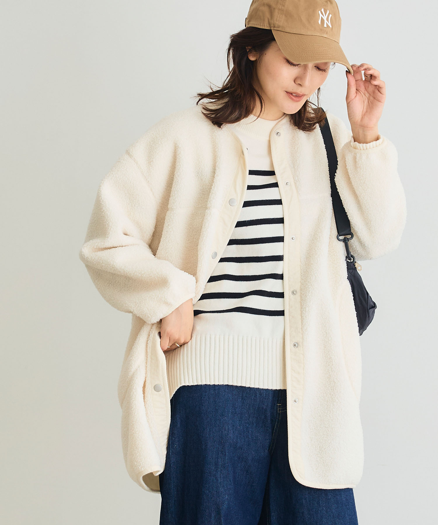 ふんわりとしたボア素材が見た目にも暖かく、1月の服装に取り入れやすい一着。ゆったりとしたシルエットで厚手トップスの上からも羽織りやすく、カジュアルながらも大人らしい抜け感を演出します。デイリーからお出かけまで活躍する万能アウターです。