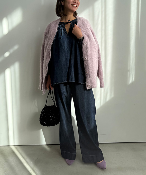 寒さが和らぎ始める1月下旬は、重ねすぎない軽快さが鍵。柔らかなカーディガンを主役に、デニムのセットアップで程よく引き締めることで、暖かさと抜け感を両立。室内外の温度差にも対応しやすく、季節の移行期に心地よい装いです。