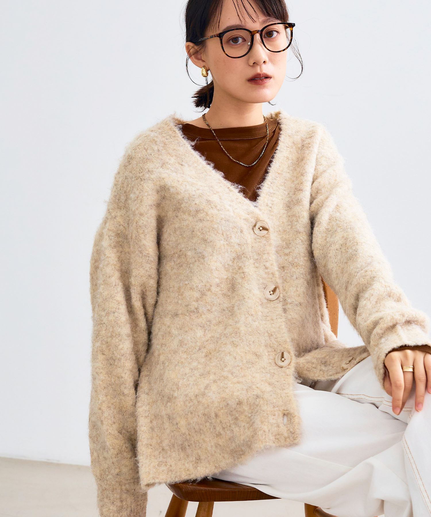 ふんわりとしたフェザー調素材が、着こなしに程よい華やぎを添えるカーディガン。重ね着してもごわつかず、1月の服装に取り入れやすい一枚。シャツやワンピースに合わせるだけで、こなれた大人スタイルが完成します。
