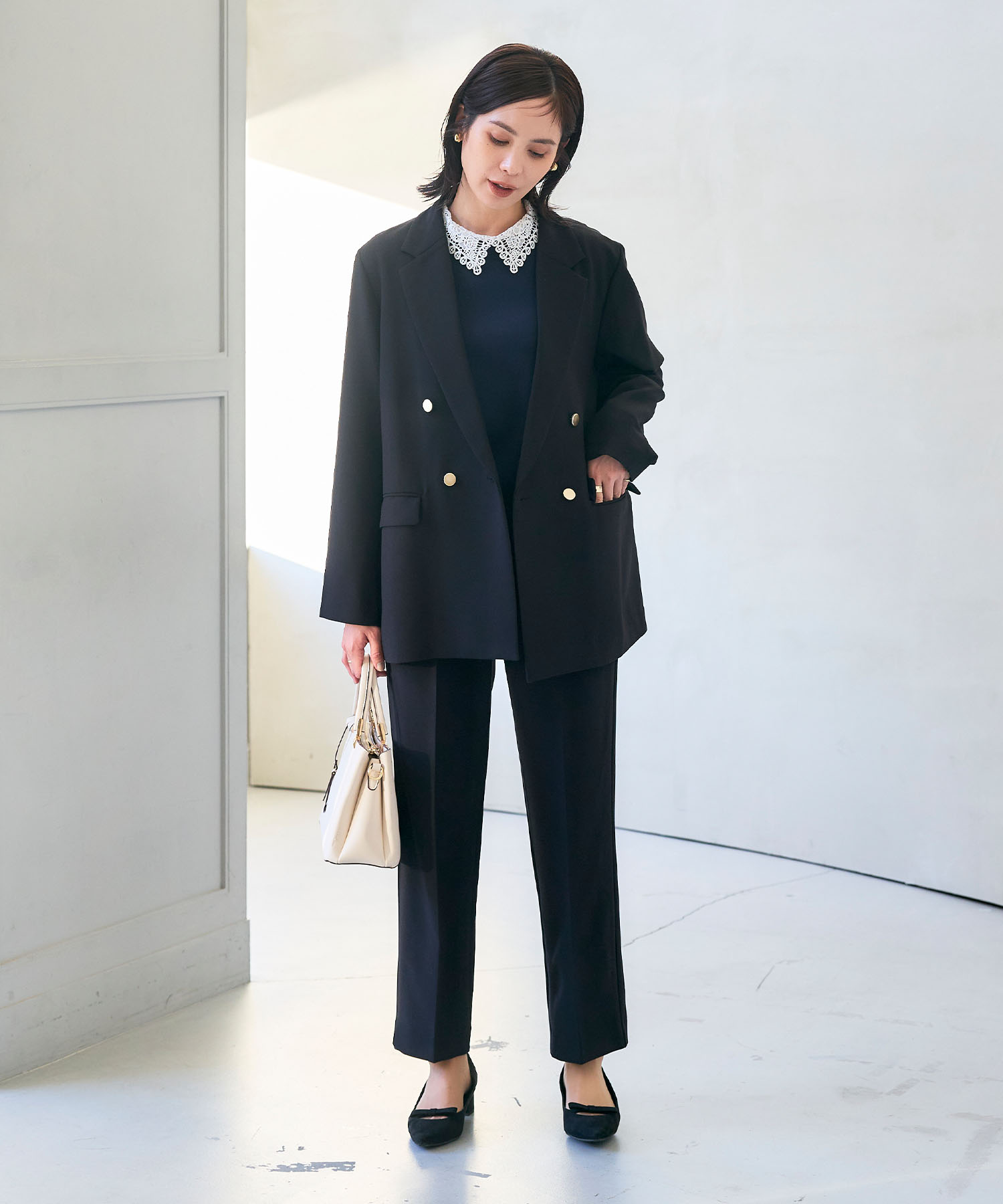 ジャケットを重ねるだけで一気に“きちんとモード”へ。モノトーンでまとめると洗練された印象をつくり、打ち合わせや外出の多い日にも安心です。ニットのレース襟とジャケットの金釦がさりげなく華やぎを添え、堅さの中に女性らしさも。忙しい日ほど頼りたくなる春のセットアップスタイルです。