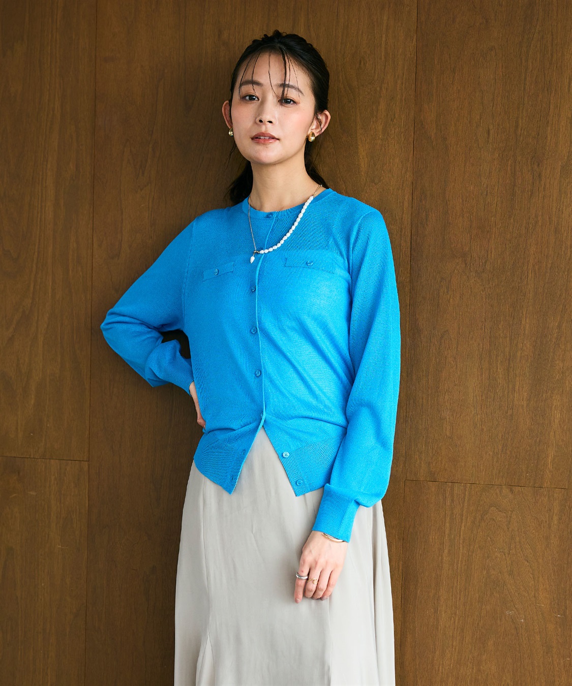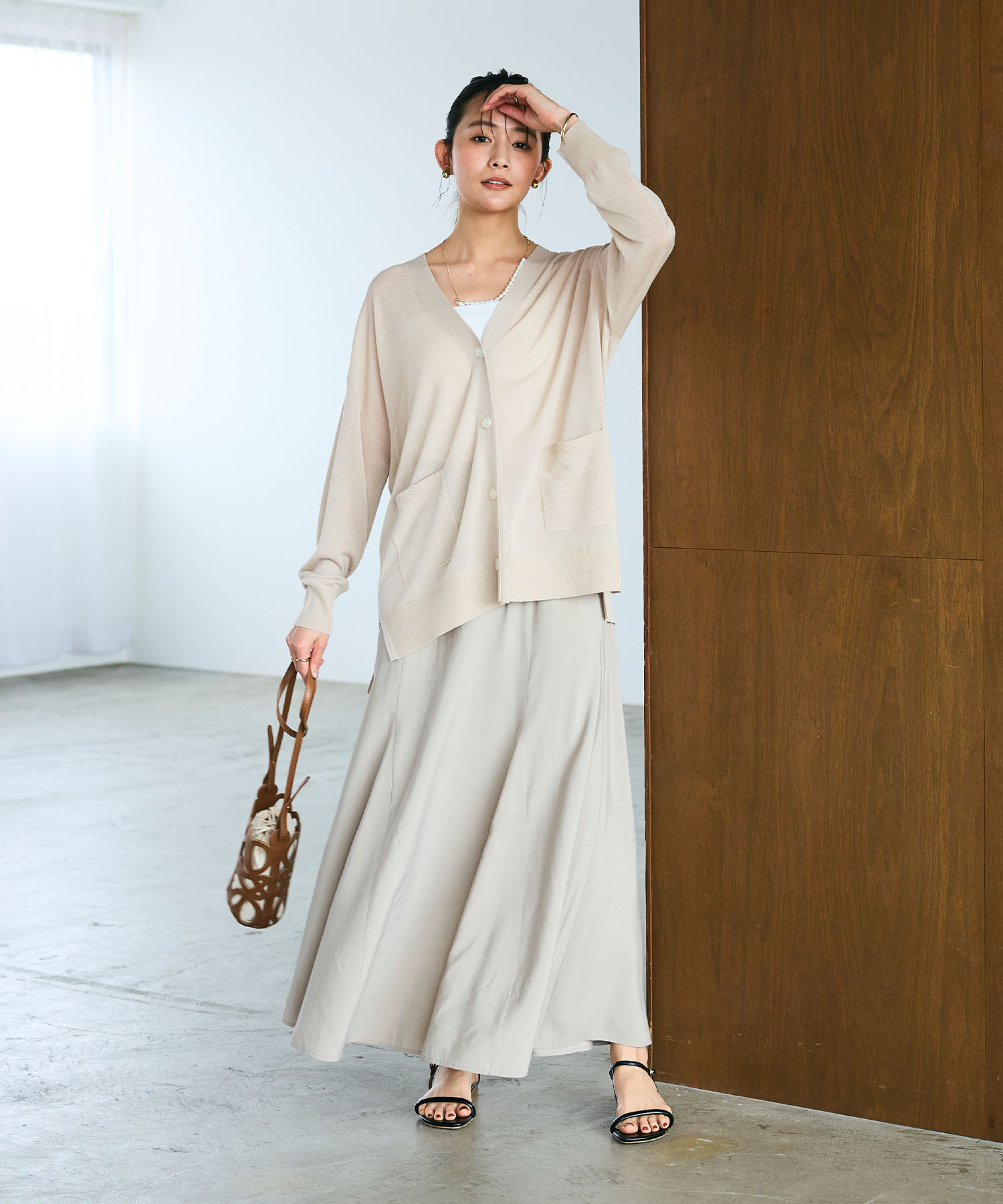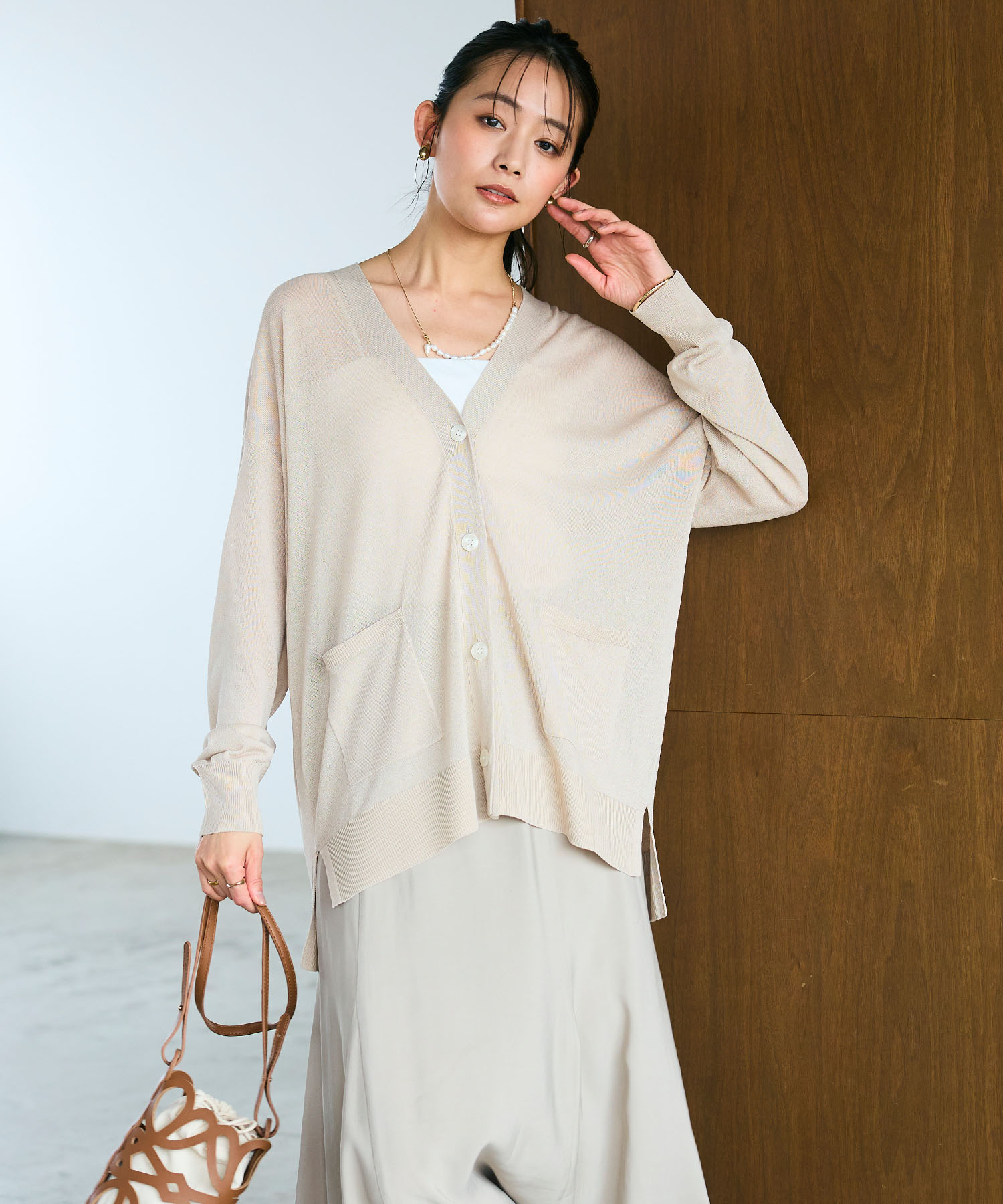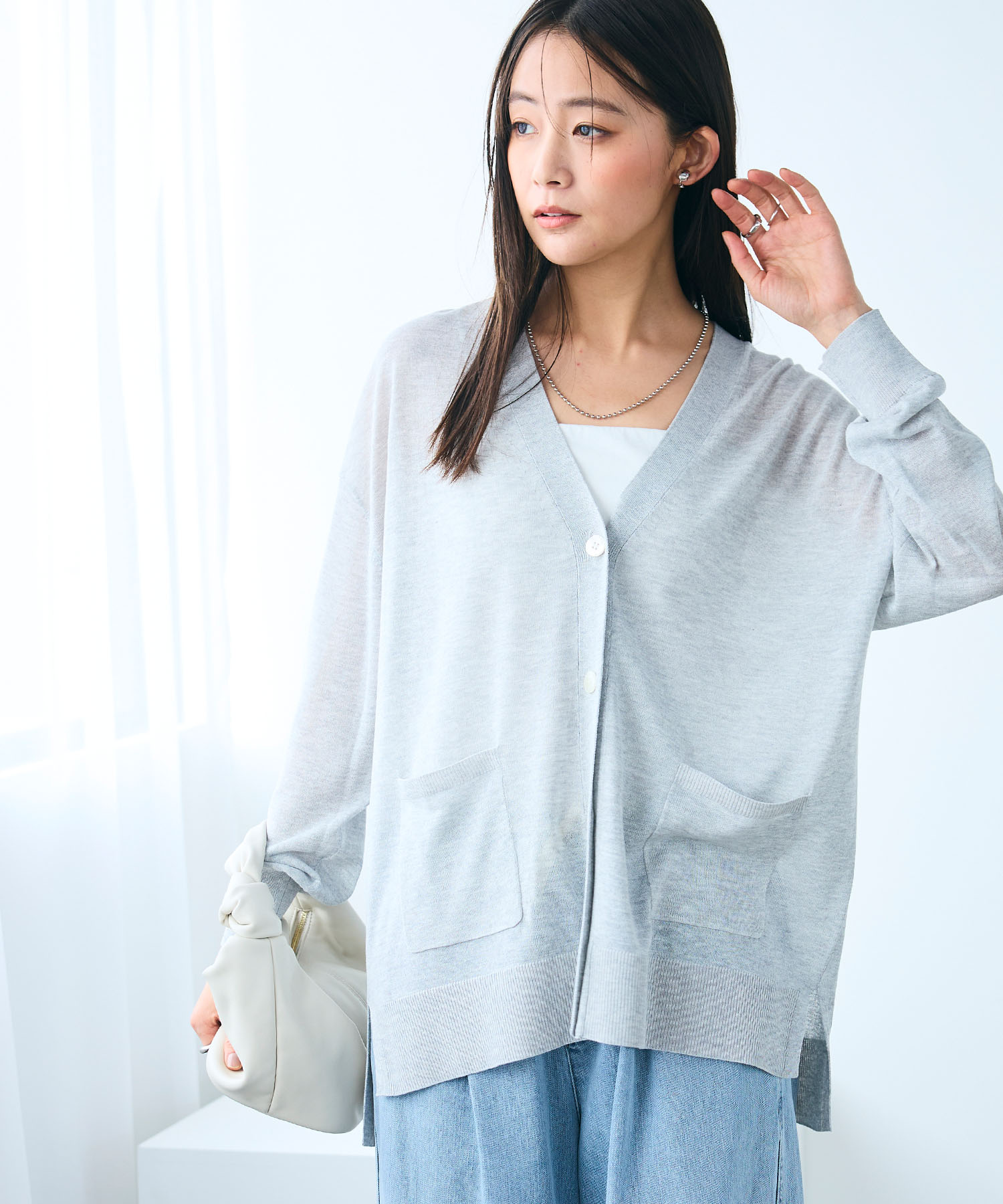 軽やかさと抜け感を出したいならシアーニットカーディガンが活躍。“透けすぎない”が大人シアー選びの鍵。インナーがほんのり透ける程度が理想です。ベージュやライトグレーなど肌なじみの良いカラーを選ぶと、やりすぎ感なく取り入れられます。朝晩の気温差や室内外の寒暖差に対応できる羽織りとしても便利な春の必需品です。