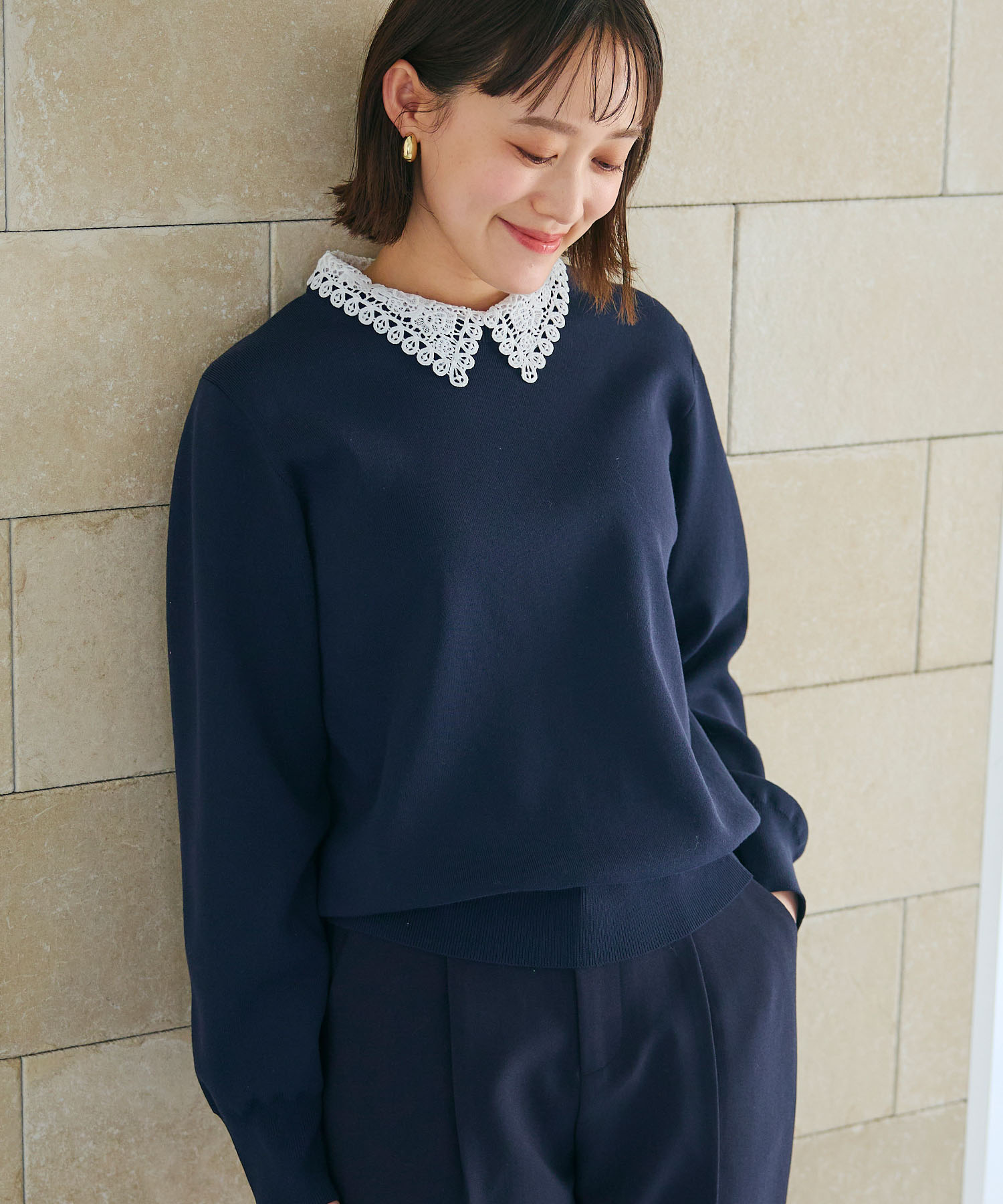 顔まわりを華やかに見せたいならレース襟の春ニットが最適。選ぶポイントは“甘さ控えめ”。繊細で小ぶりなレースを選ぶことで、大人っぽさをキープできます。ベースカラーはネイビーやブラックなど落ち着いた色にすると、オフィスでも浮かず好印象。ジャケットインにも映える万能アイテムです。