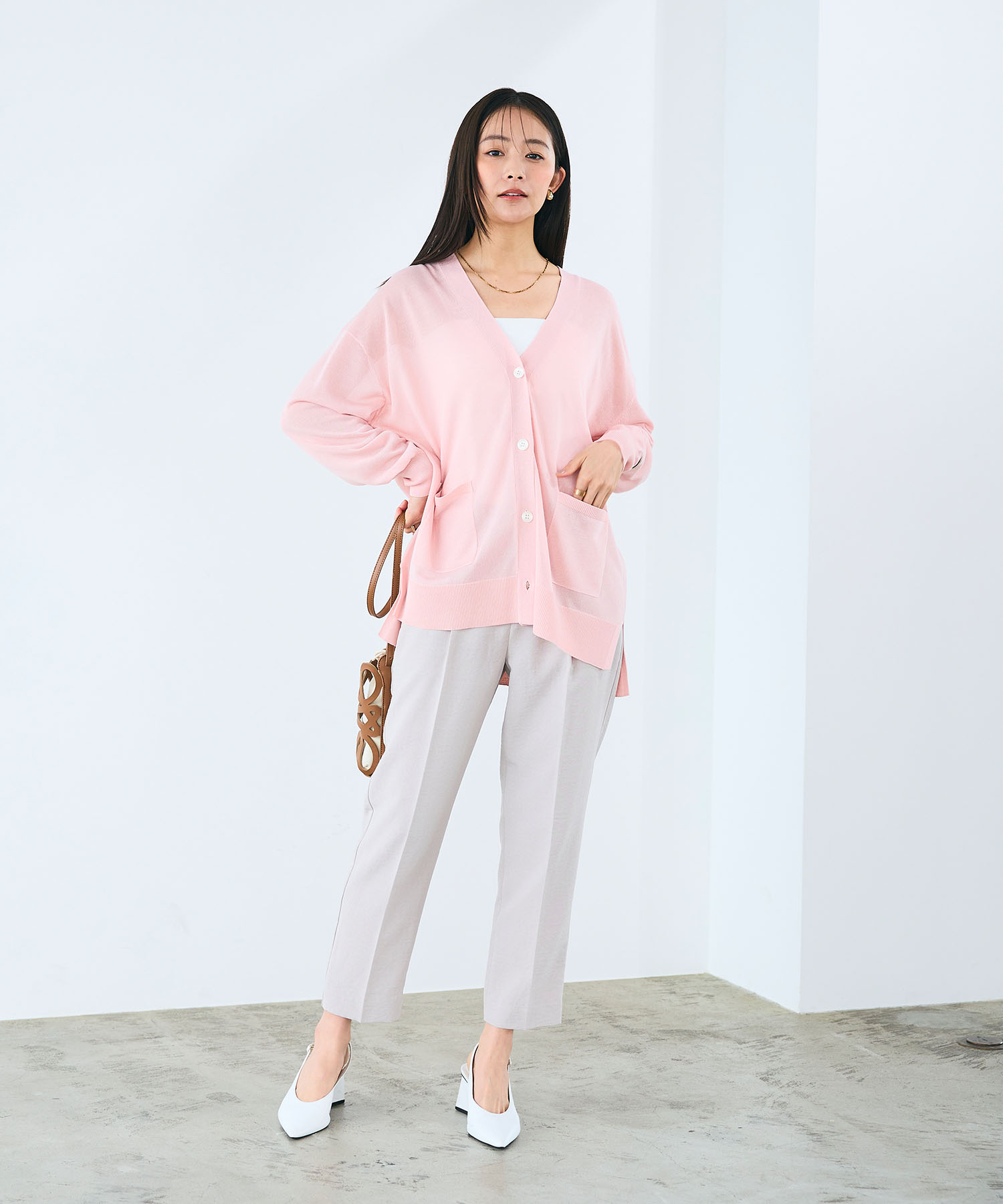 ほんのり透けるピンクニットのシアーカーディガンが、顔まわりにやさしい華やぎをプラス。淡色同士の組み合わせで、春らしい軽やかさが際立ちます。インナーとのレイヤードで奥行きも生まれ、シンプルながらも表情のある着こなしに。頑張りすぎず、それでいて女性らしさを忘れない絶妙なバランスが魅力です。