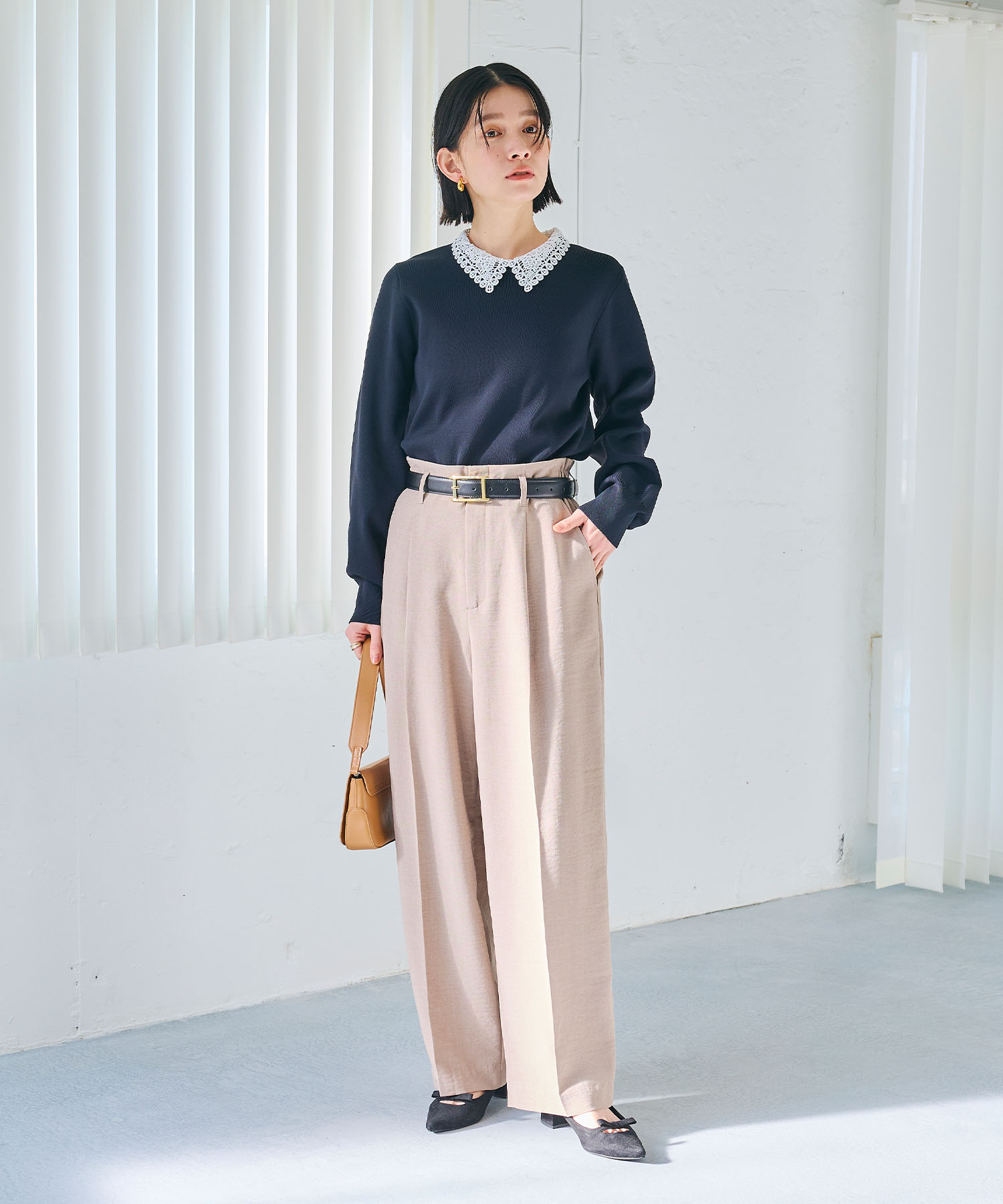 ネイビー×ベージュの組み合わせで、清潔感と知的さを両立。襟元のレースが顔まわりに春らしい華やぎを添え、シンプルなニットスタイルもぐっと女性らしい印象に。ゆったりとしたワイドパンツが抜け感を生み、堅すぎないバランスに仕上がります。子どもの送迎からそのまま出社しても違和感なく、きちんと感はキープ。小物も同系色でまとめることで、優しげな雰囲気もプラスできます。