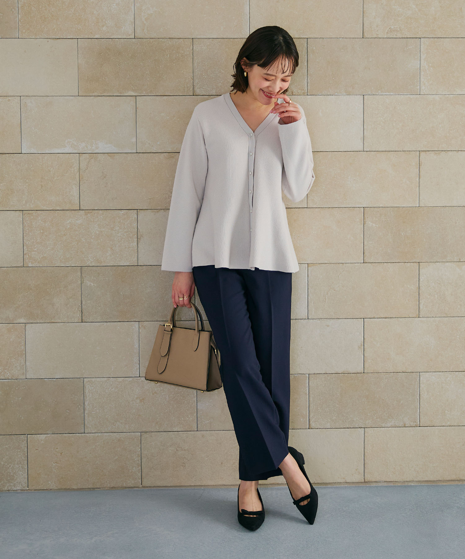 ベージュ×パールボタンのデザインニットは、スタイル全体を洗練された印象に。またペプラムデザインがシンプルながらもシルエットにほんのり動きがあり、さりげなく今っぽさを感じさせます。ネイビーパンツで引き締めることで、ぼやけず大人のバランスに。きれいめもリラックスも欲しい日にちょうどいい、春の通勤スタイルです。