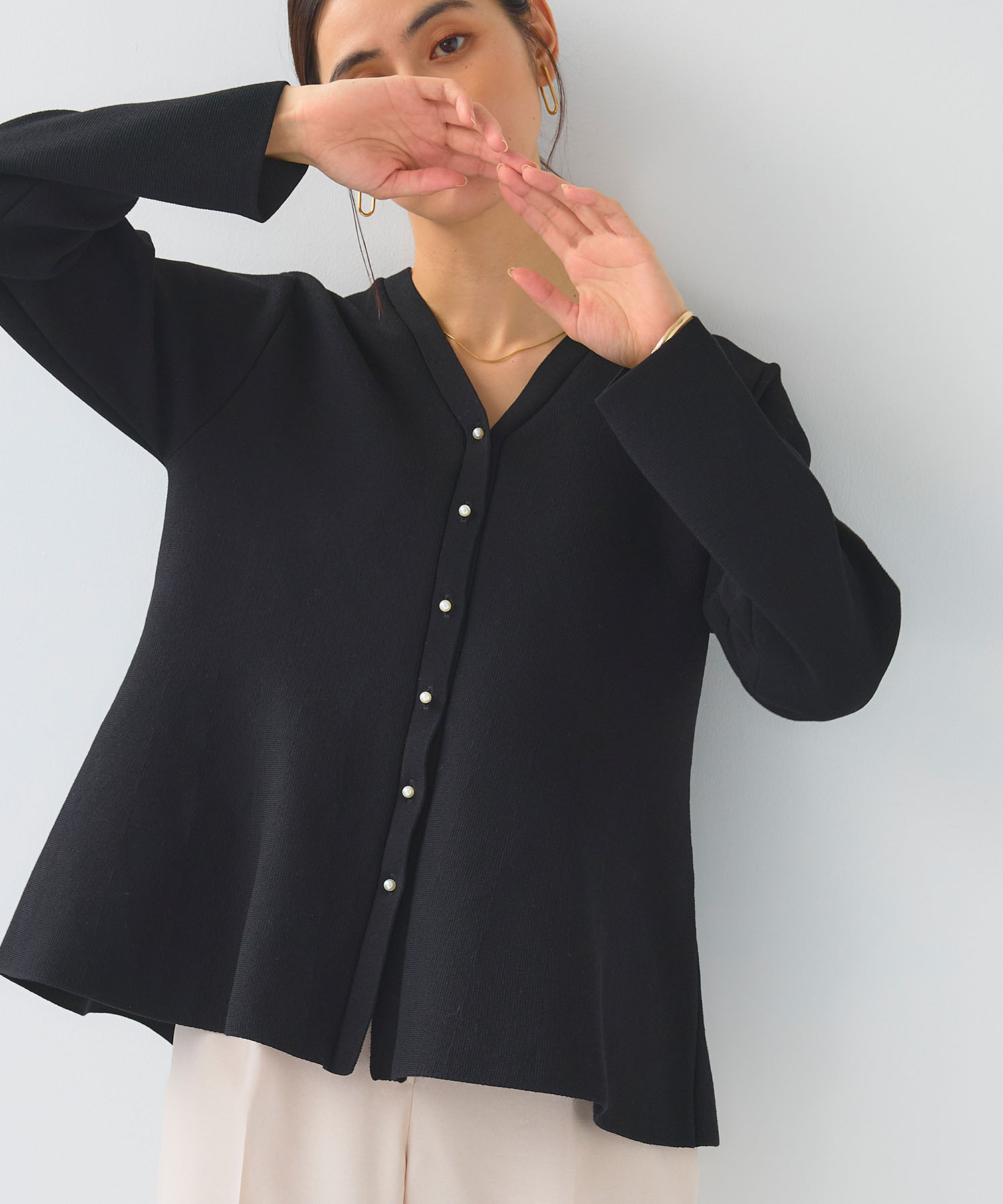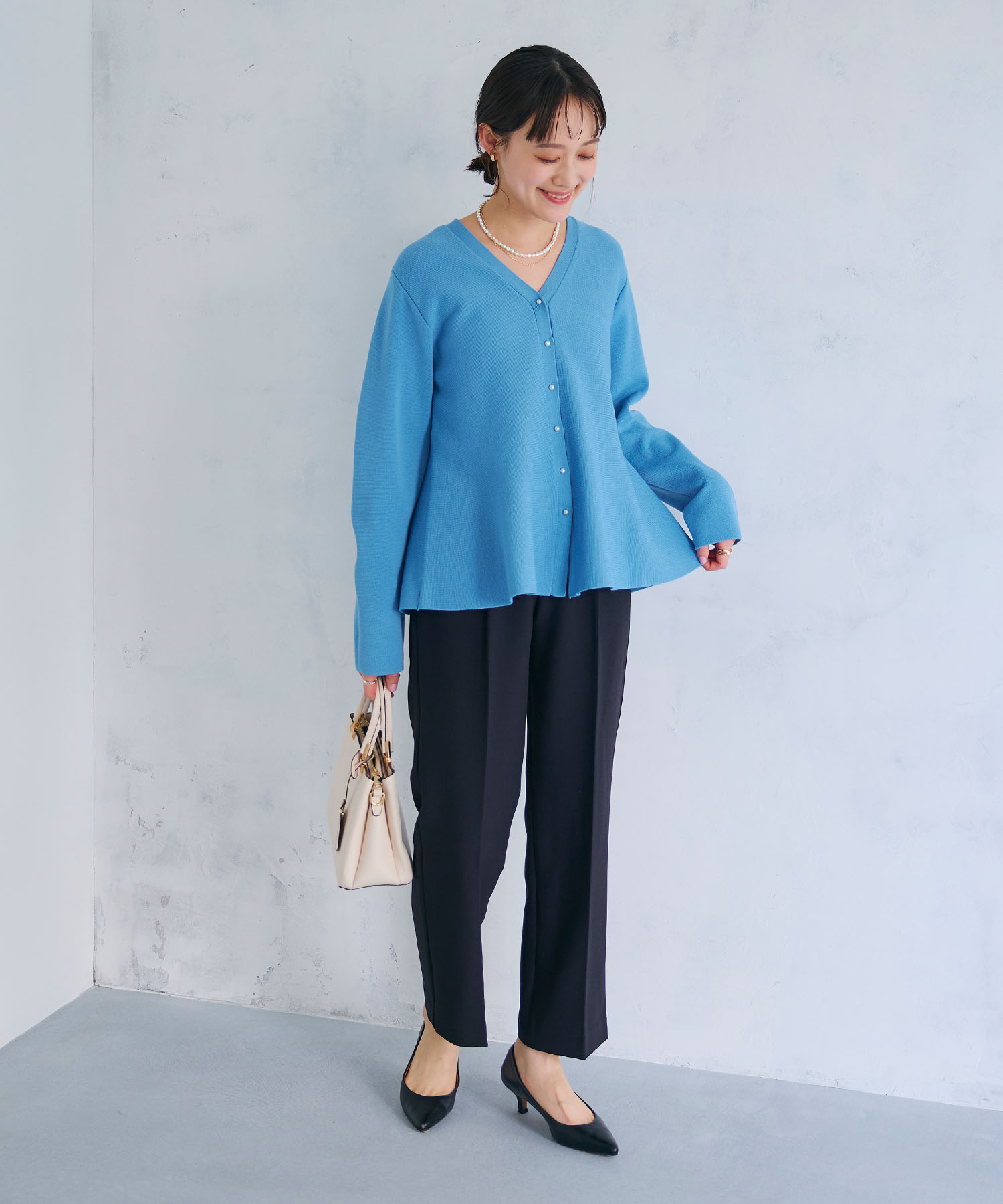 きちんと感とスタイルアップを両立するなら、パールボタン×ペプラムシルエットの春ニットがおすすめ。ウエスト切り替えで自然に体型カバーしつつ、女性らしいラインを演出。パールは大きすぎないものを選ぶと上品にまとまります。パンツにもスカートにも合わせやすく、春の通勤コーデの軸に。