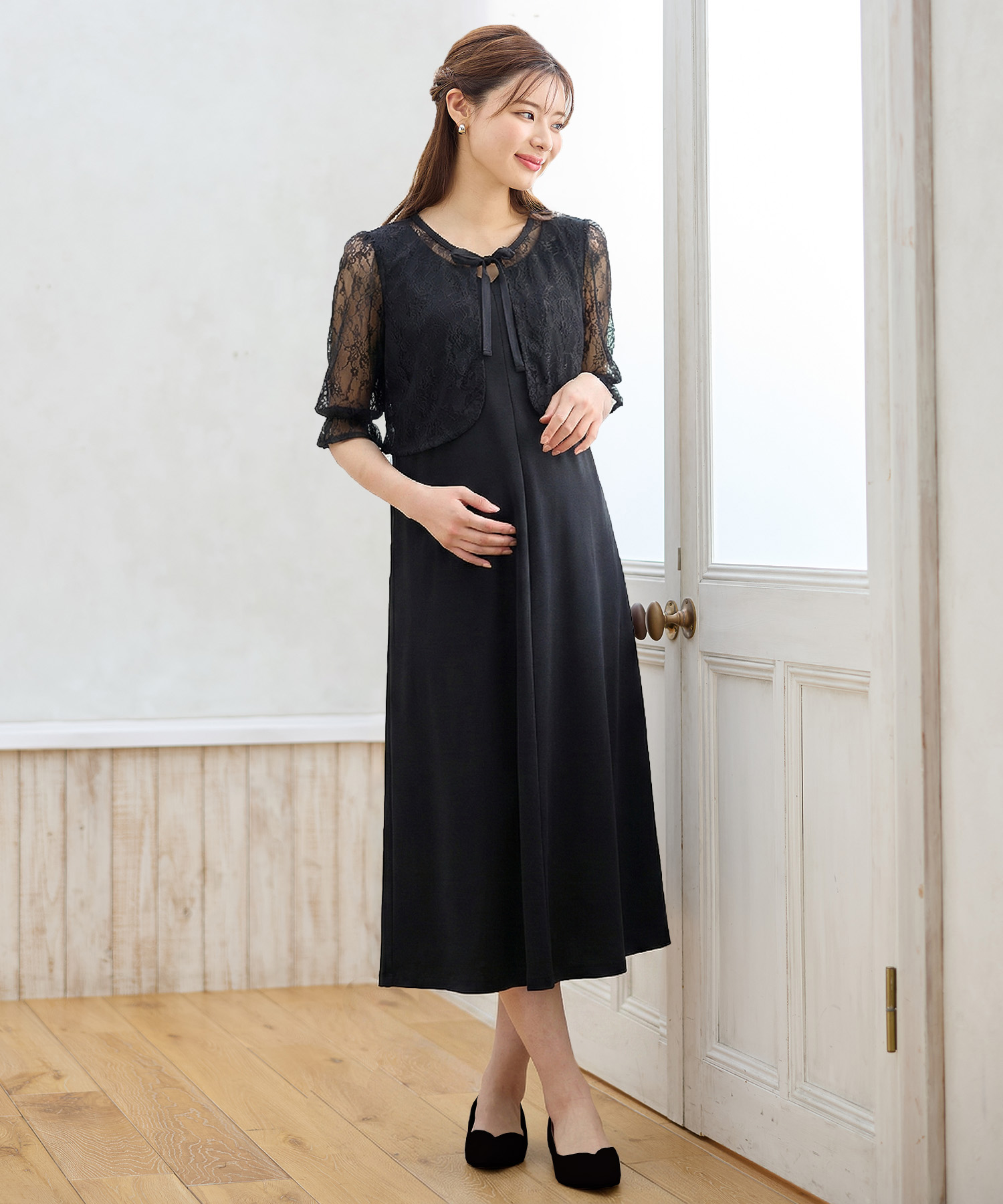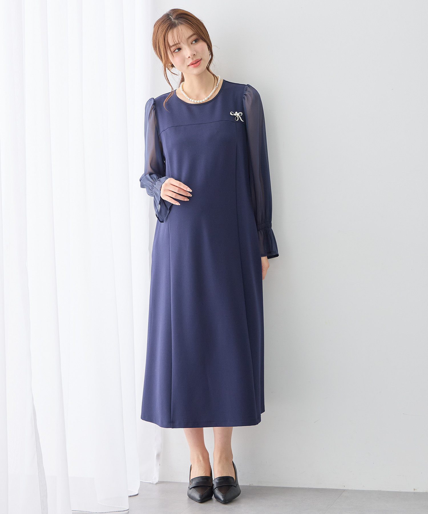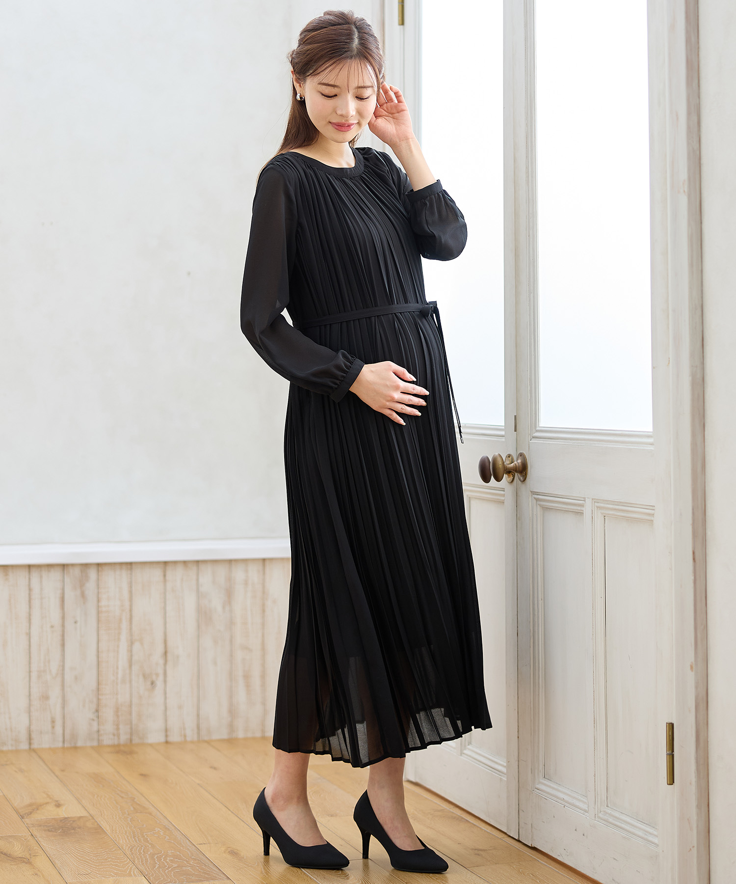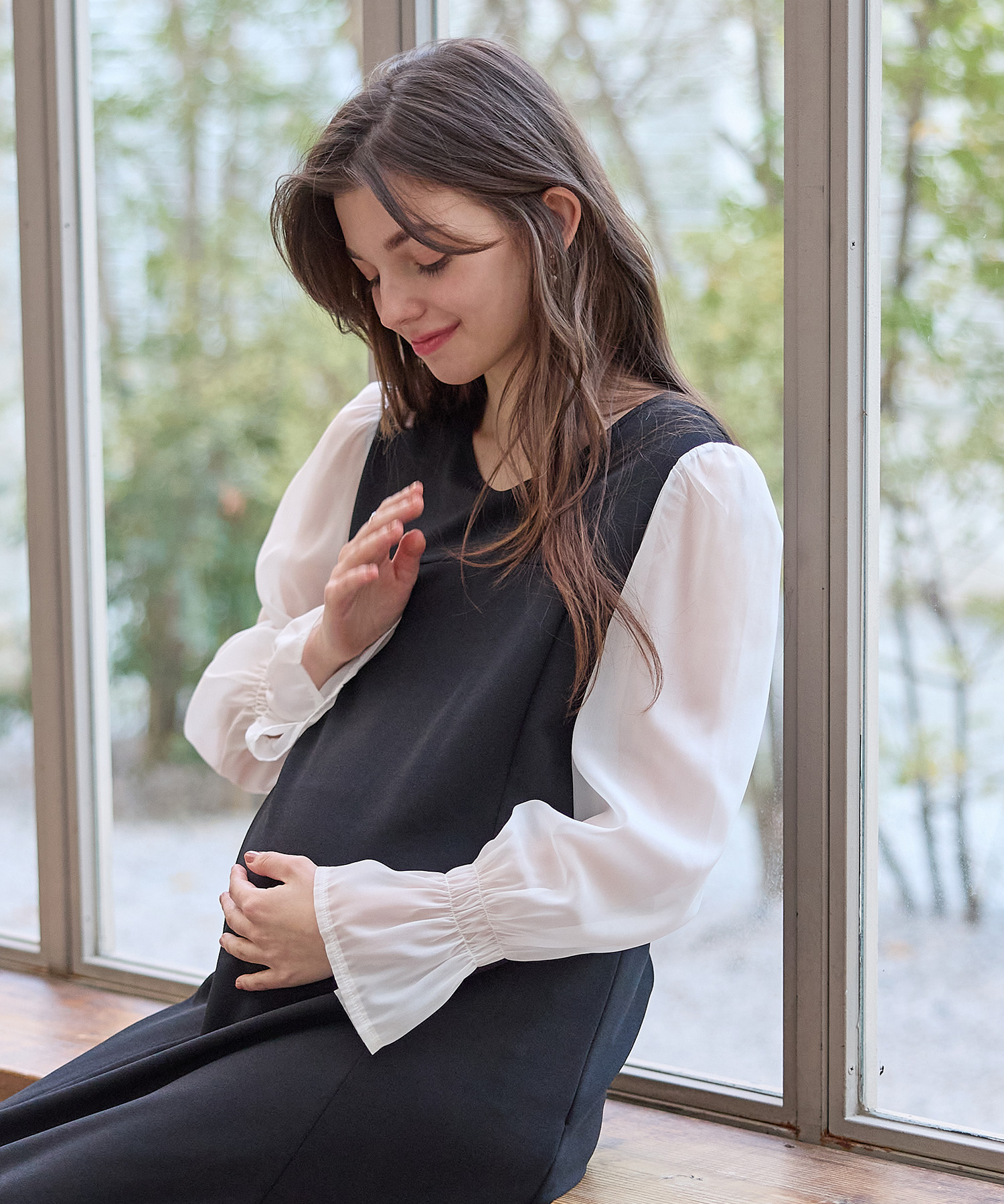 マタニティウェア特有の「ゆったり感」をあえて強調せず、計算されたタック使いで、お腹が大きくてもすっきりと美しいラインを描きます。
