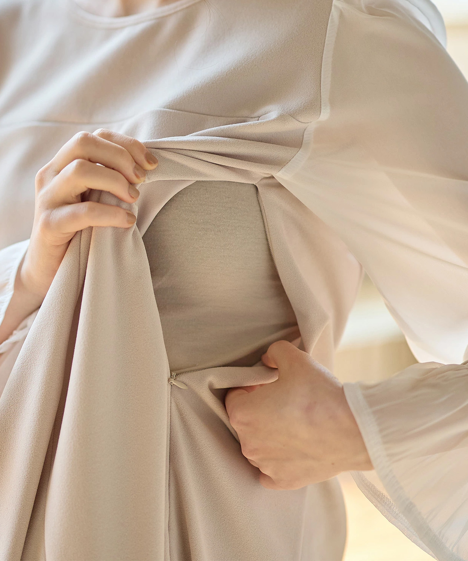 また、背面にはゴムシャーリングを施しました。 これにより、妊娠中の変化する体型には優しくフィットし、産後はウエストをキュッと細く見せる美しいブラウジングシルエットを作ります。