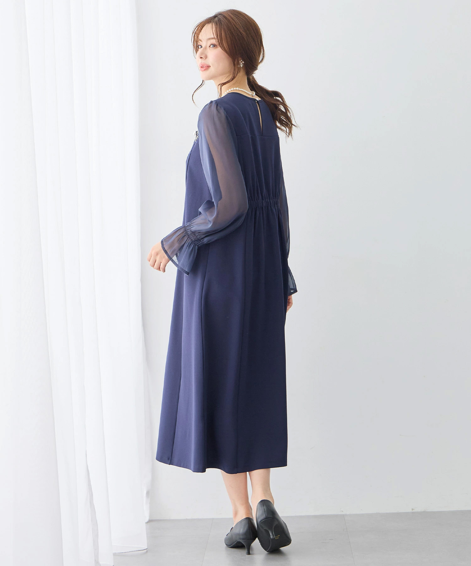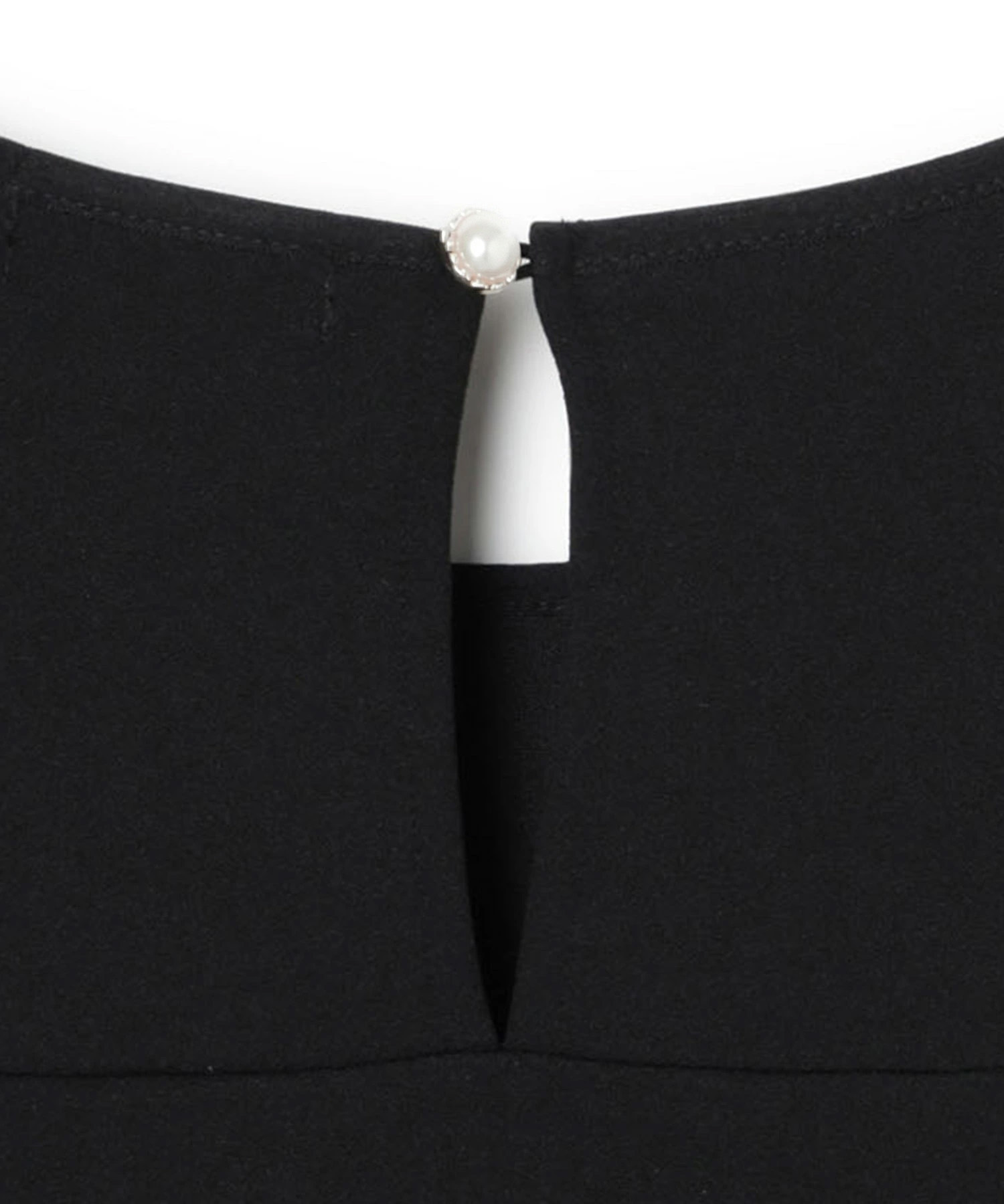 ふとした瞬間に視線を集める「後ろ姿」にも、心を配りました。 首元には、小さなパールボタンをひとつ。 髪をアップにすることが多いフォーマルシーンで、うなじを上品に彩るアクセントになります。